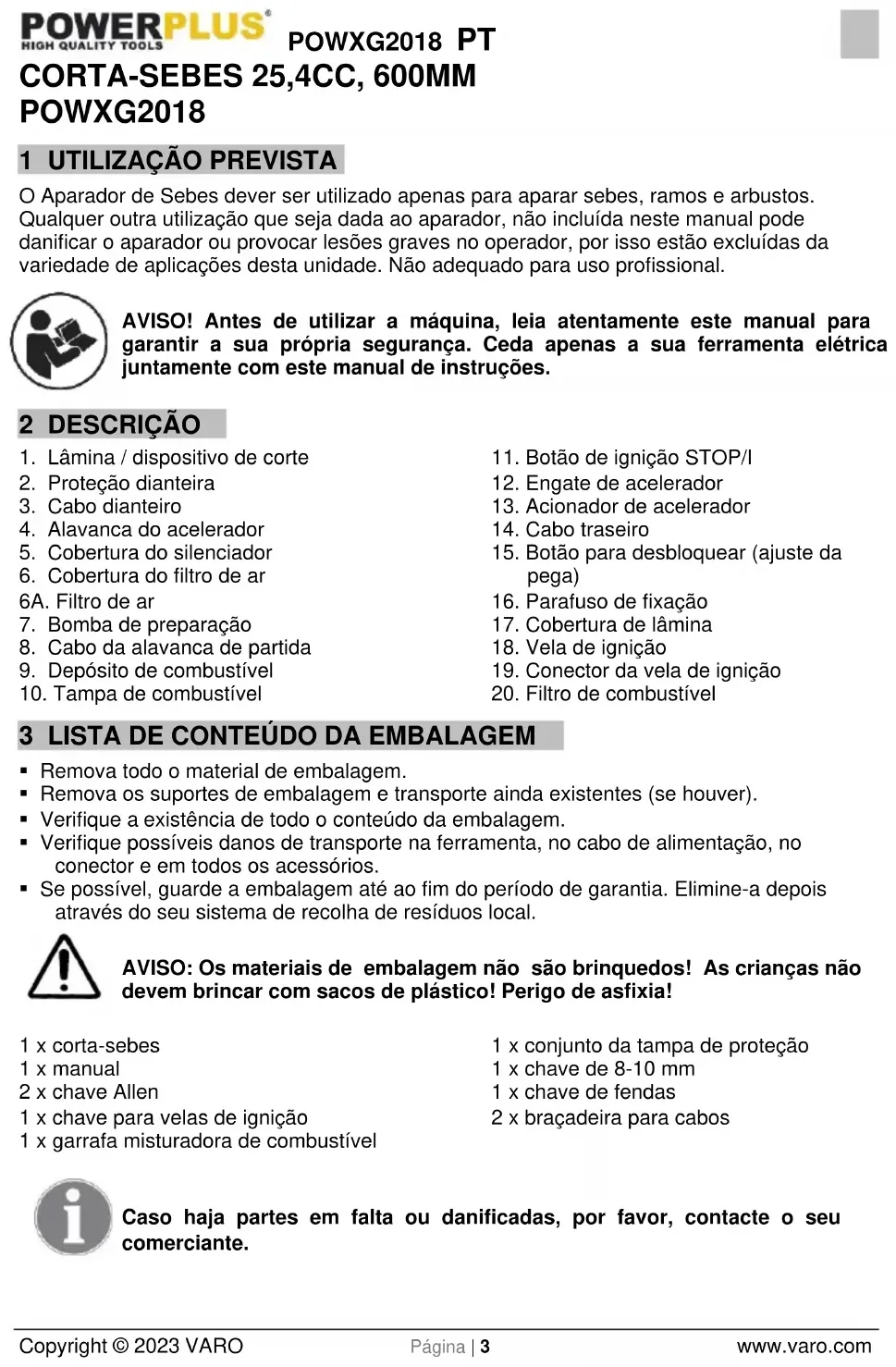 - Se possível, guarde a embalagem até ao fim do período de garantia. Elimine-a depois através do seu sistema de recolha de resíduos local. AVISO: Os materiais de embalagem não são brinquedos! As crianças não devem brincar com sacos de plástico! Perigo de asfixia! 1 x corta-sebes 1 x manual 2 x chave Allen 1 x chave para velas de ignição 1 x garrafa misturadora de combustível 1 x conjunto da tampa de proteção 1 x chave de 8-10 mm 1 x chave de fendas 2 x braçadeira para cabos Caso haja partes em falta ou danificadas, por favor, contacte o seu comerciante.POWXG2018 PT Copyright © 2023 VARO Página | 4 www.varo.com 4 SÍMBOLOS Neste manual e/ou na máquina são utilizados os seguintes símbolos: