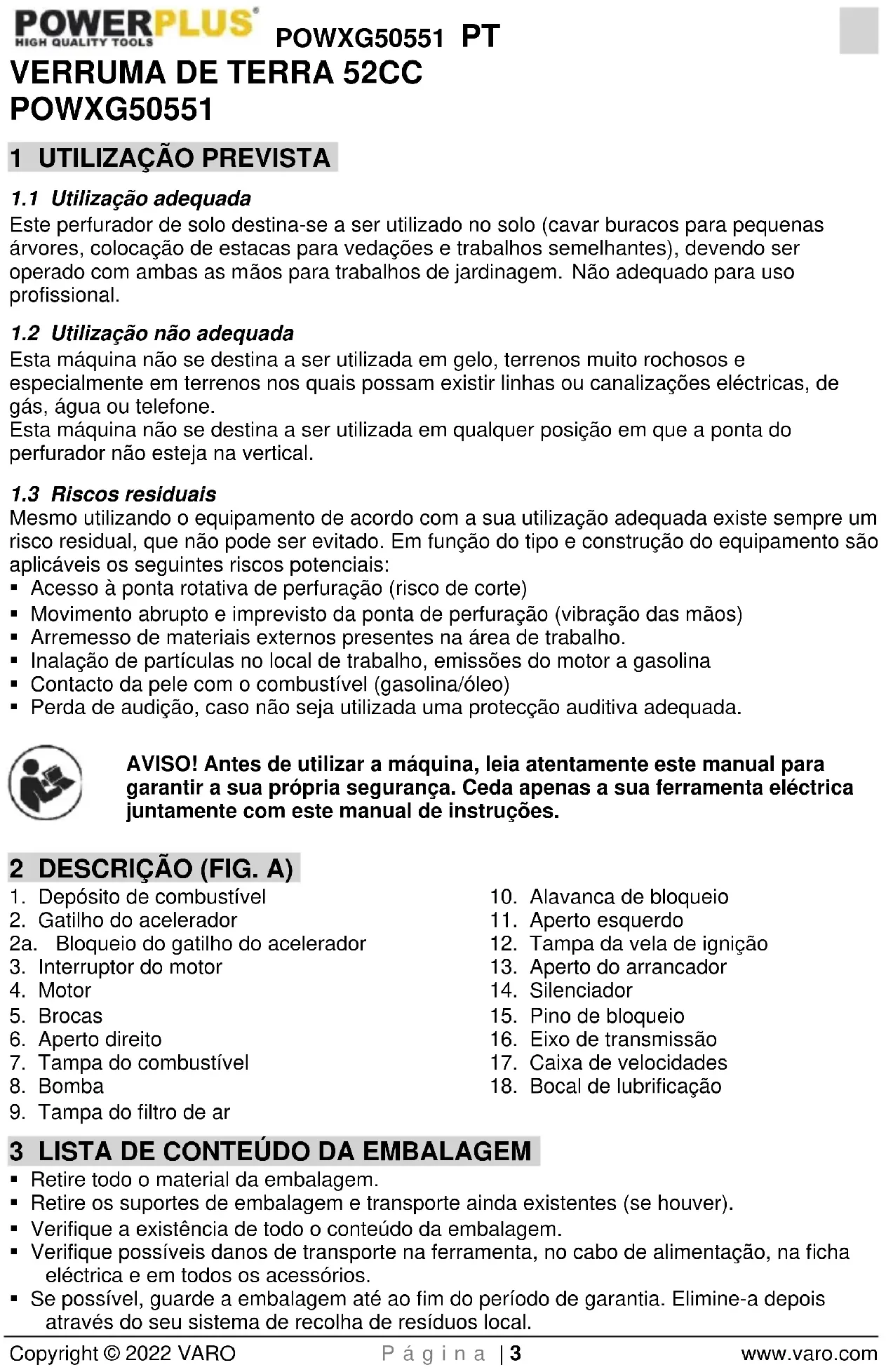 - Se possível, guarde a embalagem até ao fim do período de garantia. Elimine-a depois através do seu sistema de recolha de resíduos local.POWXG50551 PT Copyright © 2022 VARO P á g i n a | 4 www.varo.com AVISO! Os materiais de embalagem não são brinquedos! As crianças não devem brincar com sacos de plástico! Perigo de asfixia! 1 x verruma de terra 1 x brica de Ø100 mm 1 x brica de Ø150 mm 1 x brica de Ø200 mm 1 x garrafa vazia para misturar óleo/combustível 3 x pinos de bloqueio 1 x chave de velas de ignição 1 x manual de instruções Caso haja partes em falta ou danificadas, por favor, contacte o seu comerciante. 4 SÍMBOLOS Neste manual e/ou na máquina são utilizados os seguintes símbolos: