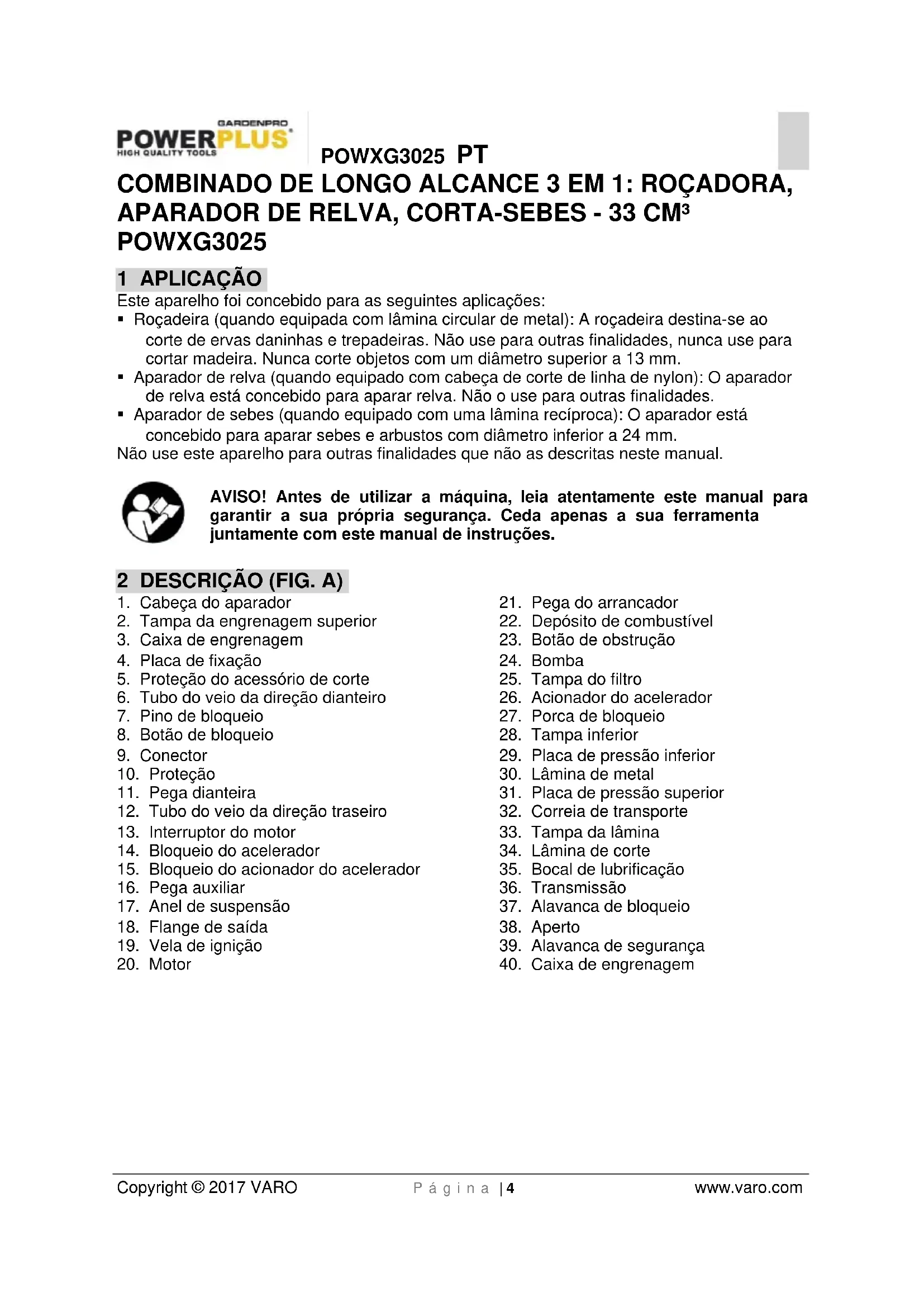 O silenciador está concebido para manter os níveis de ruído no mínimo e direcionar fumos de exaustão para longe do utilizador. Nunca use uma máquina com um silenciador defeituoso. Verifique regularmente se o silenciador está fixado em segurança à máquina. O interior do silenciador contém químicos que podem ser cancerígenos. Evite o contacto com estes elementos no caso de um silenciador danificado. Tenha em consideração que: os fumos de exaustão são quentes e podem conter faíscas que podem provocar um incêndio. Nunca inicie a máquina em áreas interiores ou próximo de material combustível! 9 EQUIPMENTO DE CORTE (ACESSÓRIO DE CORTE E APARADOR DE RELVA) Esta secção descreve como escolher e manter o seu equipamento de corte de modo a: Reduzir o impulso da lâmina. Obter máximo desempenho de corte. Prolongar a vida do equipamento de corte. IMPORTANTE: Use apenas acessórios de corte com as proteções que recomendamos! Ver o capítulo sobre Dados Técnicos. Consulte as instruções para o acessório de corte para verificar a forma correta de carregar o fio e o diâmetro correto do fio. Mantenha os dentes da lâmina corretamente afiados! Siga as nossas recomendações. Consulte também as instruções na embalagem da lâmina. Pare sempre o motor antes de realizar qualquer trabalho no acessório de corte. Este continua a rodar mesmo após soltar o acelerador. Certifique-se de que o acessório de corte parou completamente e desligue a ligação de alta tensão da vela de ignição antes de começar a trabalhar na mesma. Ao usar um acessório de corte incorreto ou uma lâmina incorretamente afiada aumenta o risco de impulso da lâmina.POWXG3025 PT Copyright © 2017 VARO P á g i n a | 10 www.varo.com