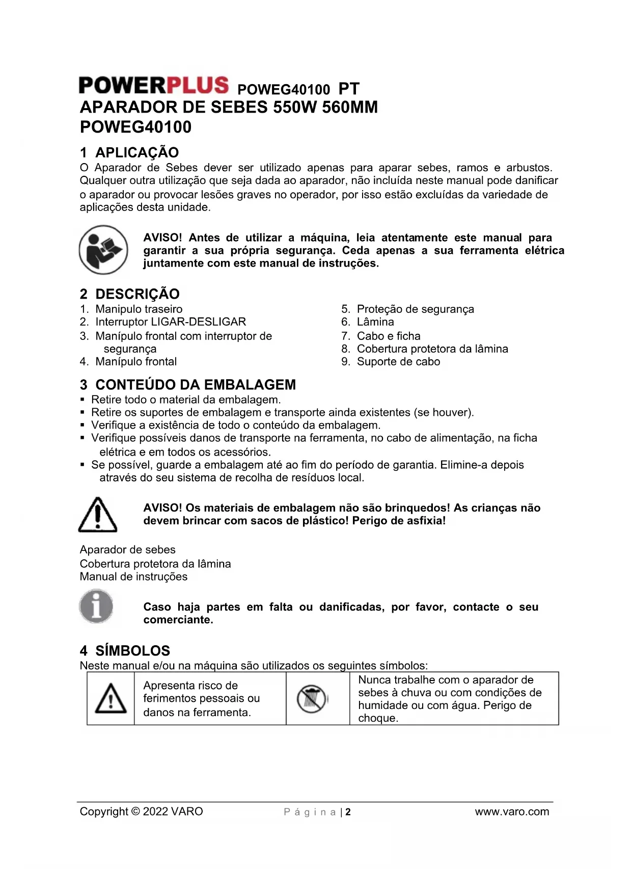Apresenta risco de ferimentos pessoais ou danos na ferramenta. Nunca trabalhe com o aparador de sebes à chuva ou com condições de humidade ou com água. Perigo de choque.POWEG40100 PT Copyright © 2022 VARO P á g i n a | 3 www.varo.com Leia cuidadosamente as instruções.