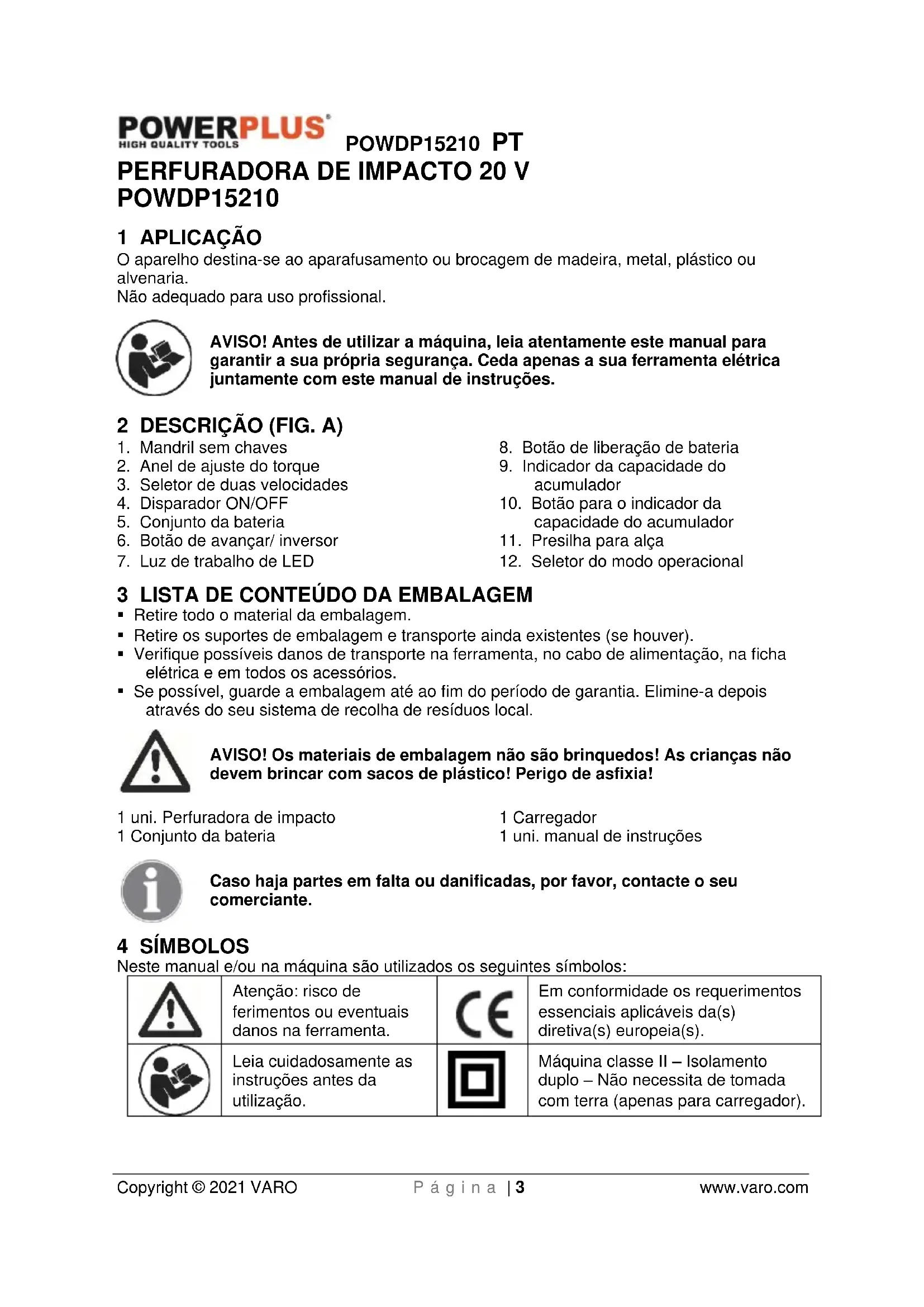 Máquina classe II – Isolamento duplo – Não necessita de tomada com terra (apenas para carregador).POWDP15210 PT Copyright © 2021 VARO P á g i n a | 4 www.varo.com