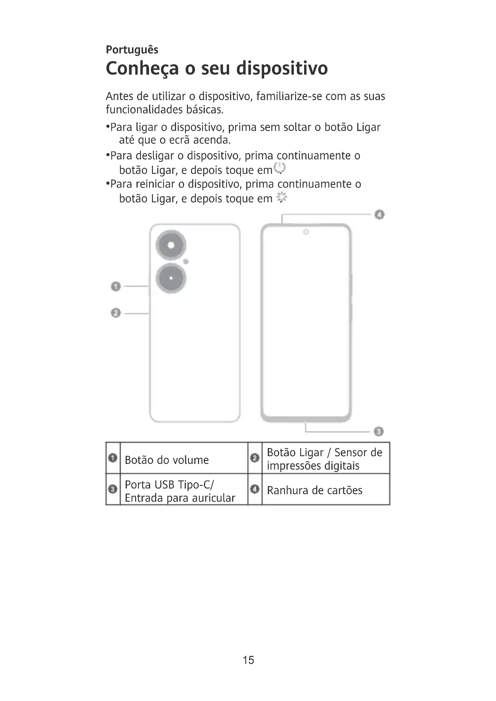 - Para reiniciar o dispositivo, prima continuamente o botão Ligar, e depois toque em . Botão do volume Botão Ligar / Sensor de impressões digitais Porta USB Tipo-C/ Entrada para auricular Ranhura de cartões 15Introdução