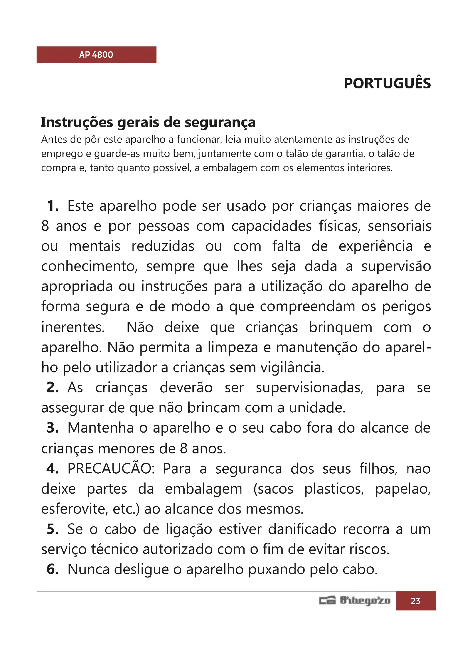 6. Nunca desligue o aparelho puxando pelo cabo.AP 4800