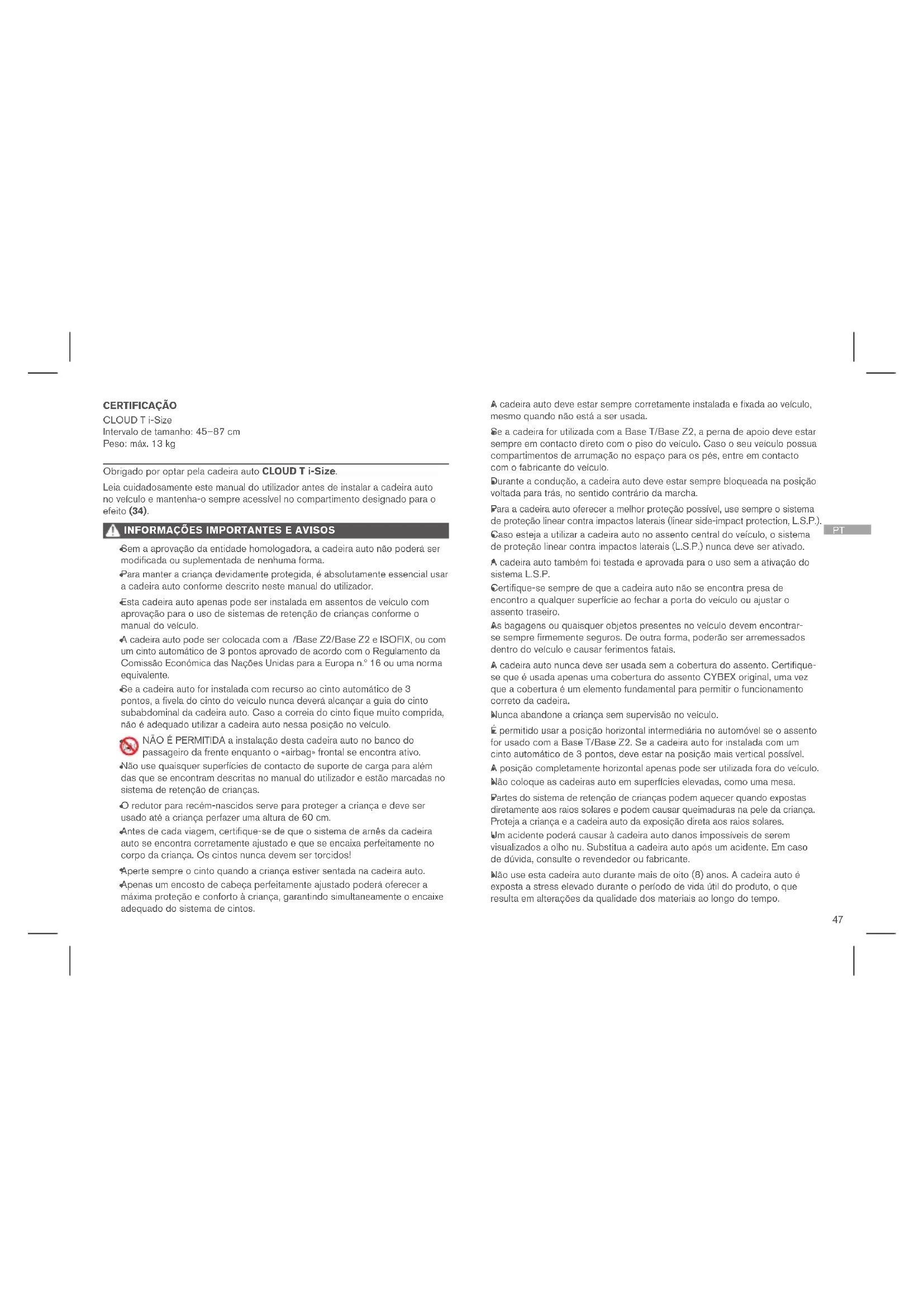Obrigado por optar pela cadeira auto CLOUD T i-Size. Leia cuidadosamente este manual do utilizador antes de instalar a cadeira auto no veículo e mantenha-o sempre acessível no compartimento designado para o efeito (34).
