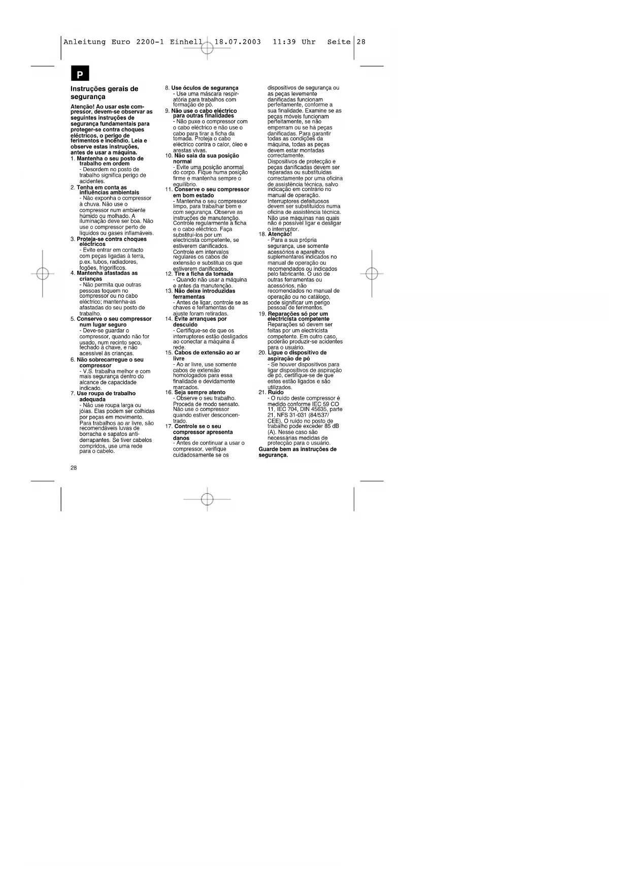 Anleitung Euro 2200-1 Einhell 18.07.2003 11:39 Uhr Seite 2728 Instruções gerais de segurança Atenção! Ao usar este com- pressor, devem-se observar as seguintes instruções de segurança fundamentais para proteger-se contra choques eléctricos, o perigo de ferimentos e incêndio. Leia e observe estas instruções, antes de usar a máquina.
