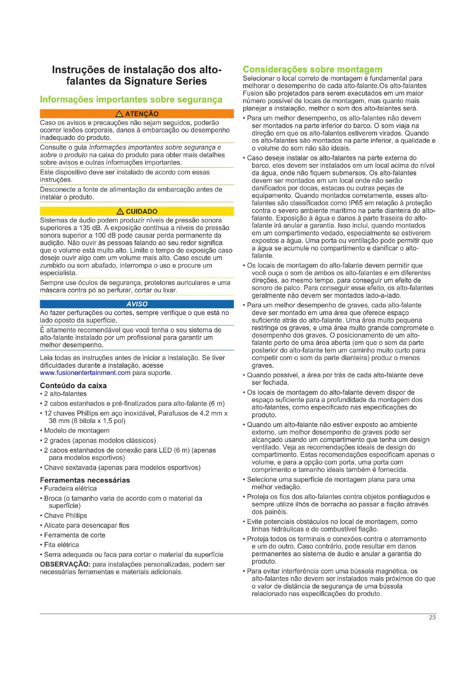 - Completamente rellena de material absorbente ** Recubierta con material absorbente 22Instruções de instalação dos alto- falantes da Signature Series Informações importantes sobre segurança ATENÇÃO Caso os avisos e precauções não sejam seguidos, poderão ocorrer lesões corporais, danos à embarcação ou desempenho inadequado do produto. Consulte o guia Informações importantes sobre segurança e sobre o produto na caixa do produto para obter mais detalhes sobre avisos e outras informações importantes. Este dispositivo deve ser instalado de acordo com essas instruções. Desconecte a fonte de alimentação da embarcação antes de instalar o produto. CUIDADO Sistemas de áudio podem produzir níveis de pressão sonora superiores a 135 dB. A exposição contínua a níveis de pressão sonora superior a 100 dB pode causar perda permanente da audição. Não ouvir às pessoas falando ao seu redor significa que o volume está muito alto. Limite o tempo de exposição caso deseje ouvir algo com um volume mais alto. Caso escute um zumbido ou som abafado, interrompa o uso e procure um especialista. Sempre use óculos de segurança, protetores auriculares e uma máscara contra pó ao perfurar, cortar ou lixar. AVISO Ao fazer perfurações ou cortes, sempre verifique o que está no lado oposto da superfície. É altamente recomendável que você tenha o seu sistema de alto-falante instalado por um profissional para garantir um melhor desempenho. Leia todas as instruções antes de iniciar a instalação. Se tiver dificuldades durante a instalação, acesse www.fusionentertainment.com para suporte. Conteúdo da caixa