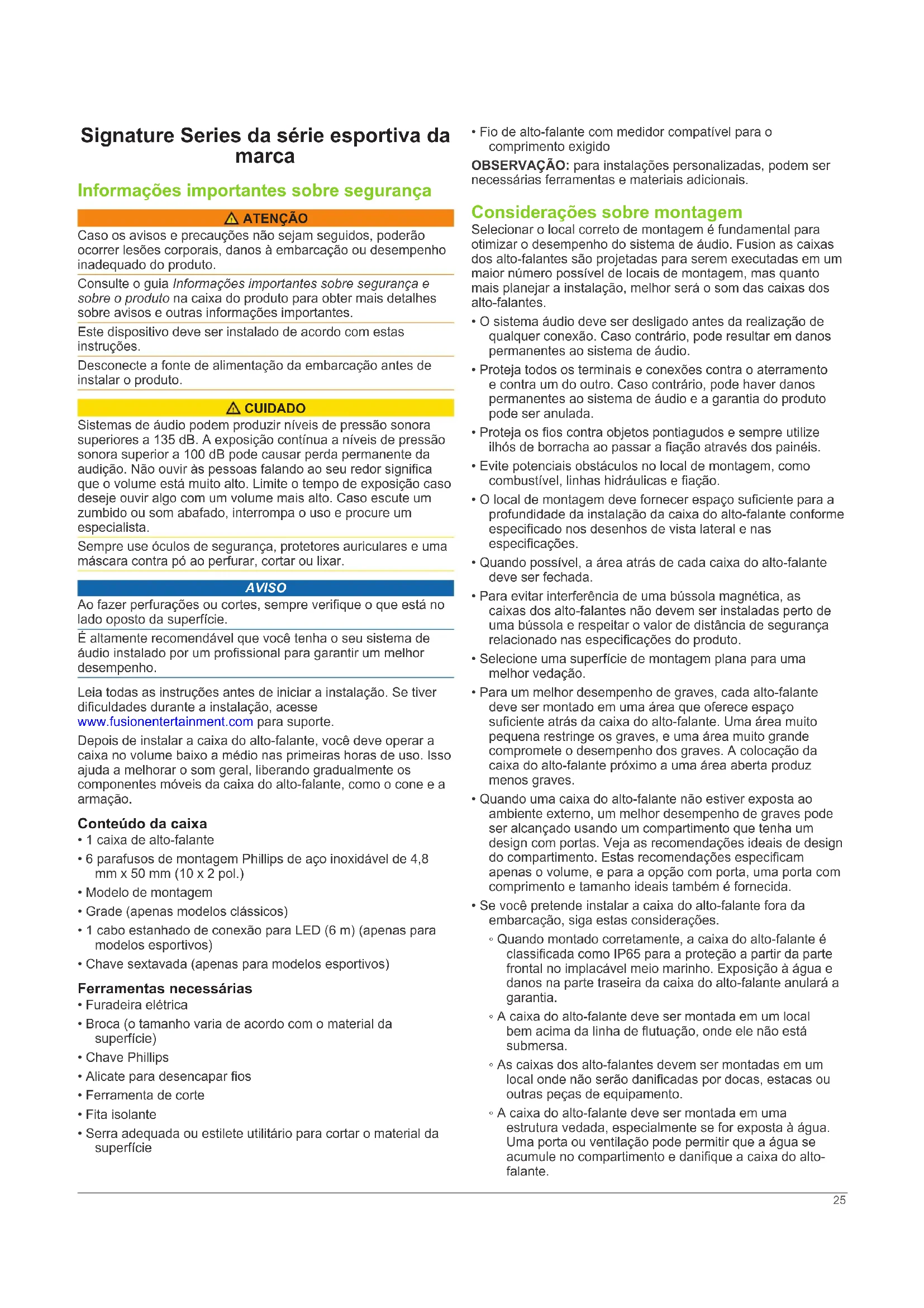 - Completamente rellena de material absorbente. ** Recubierta con material absorbente. 24Signature Series da série esportiva da marca Informações importantes sobre segurança ATENÇÃO Caso os avisos e precauções não sejam seguidos, poderão ocorrer lesões corporais, danos à embarcação ou desempenho inadequado do produto. Consulte o guia Informações importantes sobre segurança e sobre o produto na caixa do produto para obter mais detalhes sobre avisos e outras informações importantes. Este dispositivo deve ser instalado de acordo com estas instruções. Desconecte a fonte de alimentação da embarcação antes de instalar o produto. CUIDADO Sistemas de áudio podem produzir níveis de pressão sonora superiores a 135 dB. A exposição contínua a níveis de pressão sonora superior a 100 dB pode causar perda permanente da audição. Não ouvir às pessoas falando ao seu redor significa que o volume está muito alto. Limite o tempo de exposição caso deseje ouvir algo com um volume mais alto. Caso escute um zumbido ou som abafado, interrompa o uso e procure um especialista. Sempre use óculos de segurança, protetores auriculares e uma máscara contra pó ao perfurar, cortar ou lixar. AVISO Ao fazer perfurações ou cortes, sempre verifique o que está no lado oposto da superfície. É altamente recomendável que você tenha o seu sistema de áudio instalado por um profissional para garantir um melhor desempenho. Leia todas as instruções antes de iniciar a instalação. Se tiver dificuldades durante a instalação, acesse www.fusionentertainment.com para suporte. Depois de instalar a caixa do alto-falante, você deve operar a caixa no volume baixo a médio nas primeiras horas de uso. Isso ajuda a melhorar o som geral, liberando gradualmente os componentes móveis da caixa do alto-falante, como o cone e a armação. Conteúdo da caixa