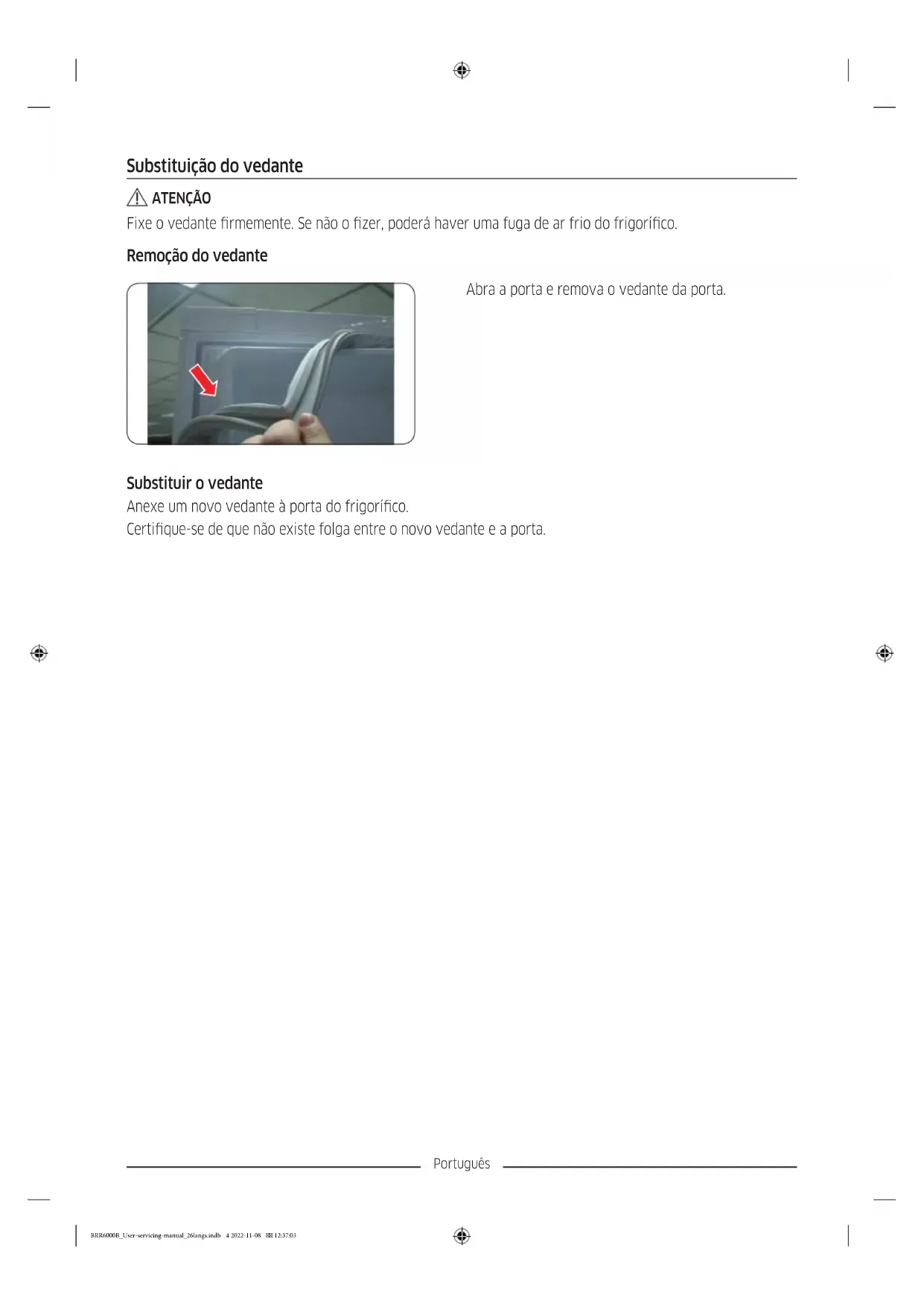 01 Painel principal 02 Prateleira 03 Gaveta (normal/grande) 04 Etiqueta de código de barras BRR6000B_User-servicing-manual_26langs.indb 3 2022-11-08 12:37:03Português Substituição do vedante ATENÇÃO Fixe o vedante rmemente. Se não o zer, poderá haver uma fuga de ar frio do frigoríco. Remoção do vedante Abra a porta e remova o vedante da porta. Substituir o vedante Anexe um novo vedante à porta do frigoríco. Certique-se de que não existe folga entre o novo vedante e a porta. BRR6000B_User-servicing-manual_26langs.indb 4 2022-11-08 12:37:03Português Substituição da gaveta ATENÇÃO Durante a montagem, verique se a gaveta está corretamente inserida na guia. Remoção da gaveta Levante cuidadosamente a parte da frente da gaveta e faça-a deslizar para fora. Reinstalação das gavetas A reinstalação das gavetas segue a ordem inversa dos passos de remoção. Substituição das dobradiças Para substituir as dobradiças, tem de remover as portas primeiro. AVISO
