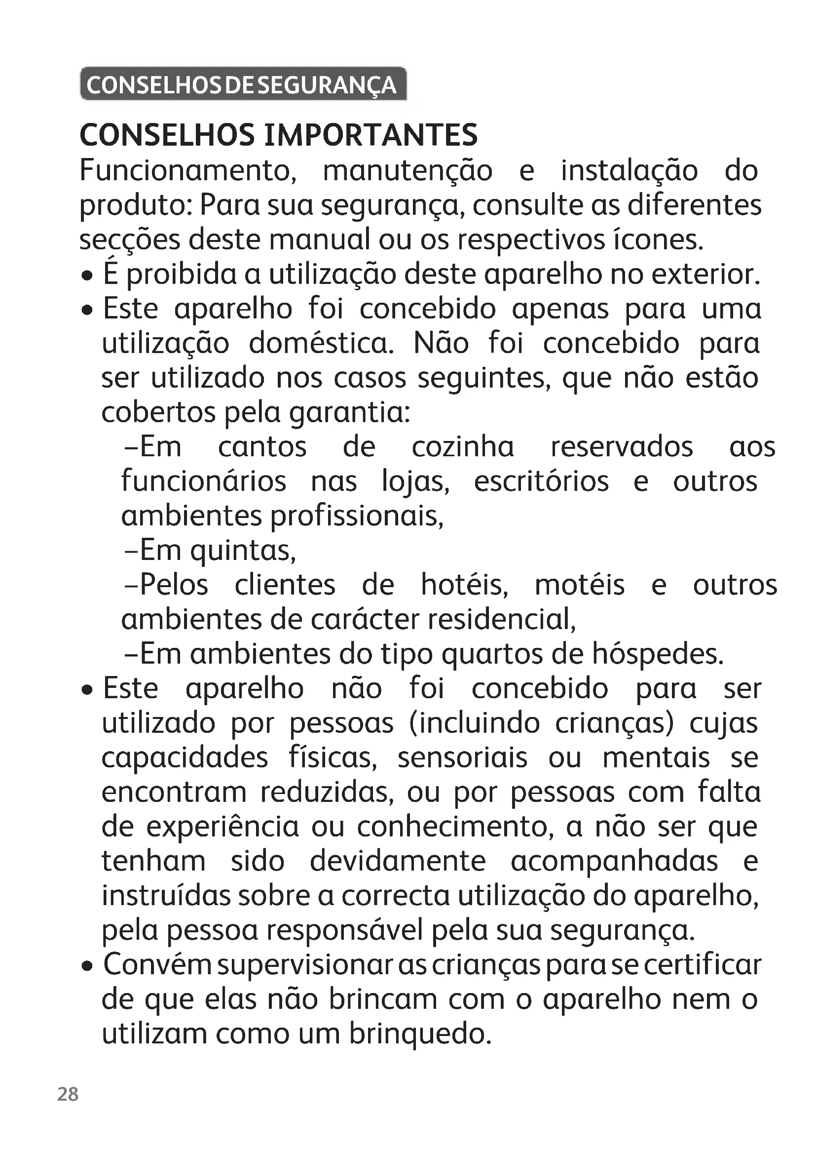 - Después del precalentamiento, el aparato está preparado para ser utilizado. 27CONSELHOS IMPORTANTES Funcionamento, manutenção e instalação do produto: Para sua segurança, consulte as diferentes secções deste manual ou os respectivos ícones.