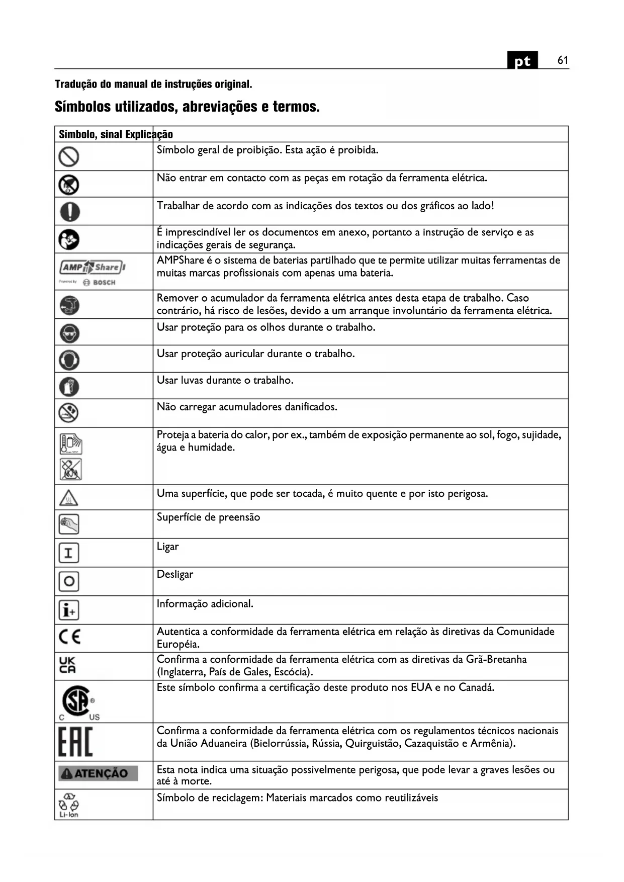 Tradução do manual de instruções original. Símbolos utilizados, abreviações e termos. Símbolo, sinal Explicação Símbolo geral de proibição. Esta ação é proibida. Não entrar em contacto com as peças em rotação da ferramenta elétrica. Trabalhar de acordo com as indicações dos textos ou dos gráficos ao lado! É imprescindível ler os documentos em anexo, portanto a instrução de serviço e as indicações gerais de segurança. AMPShare é o sistema de baterias partilhado que te permite utilizar muitas ferramentas de muitas marcas profissionais com apenas uma bateria. Remover o acumulador da ferramenta elétrica antes desta etapa de trabalho. Caso contrário, há risco de lesões, devido a um arranque involuntário da ferramenta elétrica. Usar proteção para os olhos durante o trabalho. Usar proteção auricular durante o trabalho. Usar luvas durante o trabalho. Não carregar acumuladores danificados. Proteja a bateria do calor, por ex., também de exposição permanente ao sol, fogo, sujidade, água e humidade. Uma superfície, que pode ser tocada, é muito quente e por isto perigosa. Superfície de preensão Ligar Desligar Informação adicional. Autentica a conformidade da ferramenta elétrica em relação às diretivas da Comunidade Européia. Confirma a conformidade da ferramenta elétrica com as diretivas da Grã-Bretanha (Inglaterra, País de Gales, Escócia). Este símbolo confirma a certificação deste produto nos EUA e no Canadá. Confirma a conformidade da ferramenta elétrica com os regulamentos técnicos nacionais da União Aduaneira (Bielorrússia, Rússia, Quirguistão, Cazaquistão e Armênia). Esta nota indica uma situação possivelmente perigosa, que pode levar a graves lesões ou até à morte. Símbolo de reciclagem: Materiais marcados como reutilizáveis max.50°C62