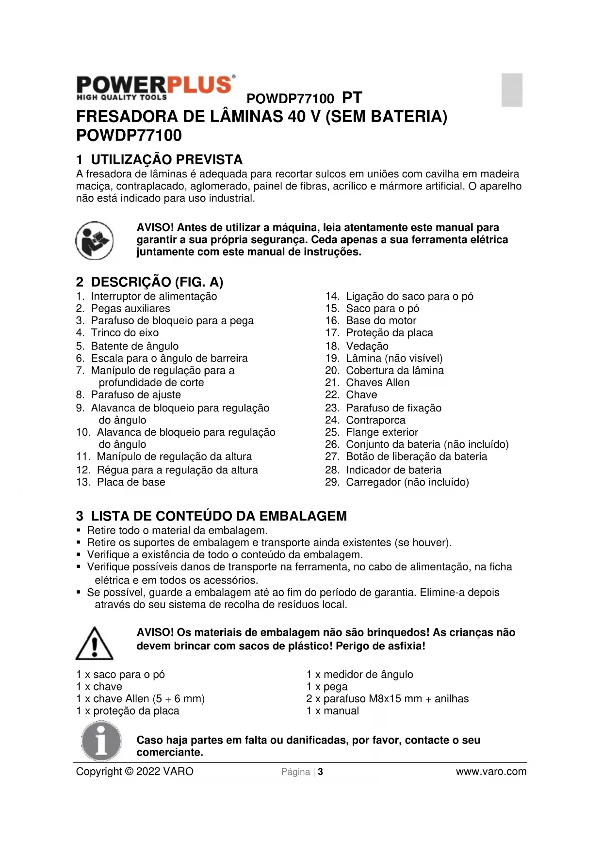 - Se possível, guarde a embalagem até ao fim do período de garantia. Elimine-a depois através do seu sistema de recolha de resíduos local. AVISO! Os materiais de embalagem não são brinquedos! As crianças não devem brincar com sacos de plástico! Perigo de asfixia! 1 x saco para o pó 1 x chave 1 x chave Allen (5 + 6 mm) 1 x proteção da placa 1 x medidor de ângulo 1 x pega 2 x parafuso M8x15 mm + anilhas 1 x manual Caso haja partes em falta ou danificadas, por favor, contacte o seu comerciante.POWDP77100 PT Copyright © 2022 VARO Página | 4 www.varo.com 4 SÍMBOLOS Neste manual e/ou na máquina são utilizados os seguintes símbolos: