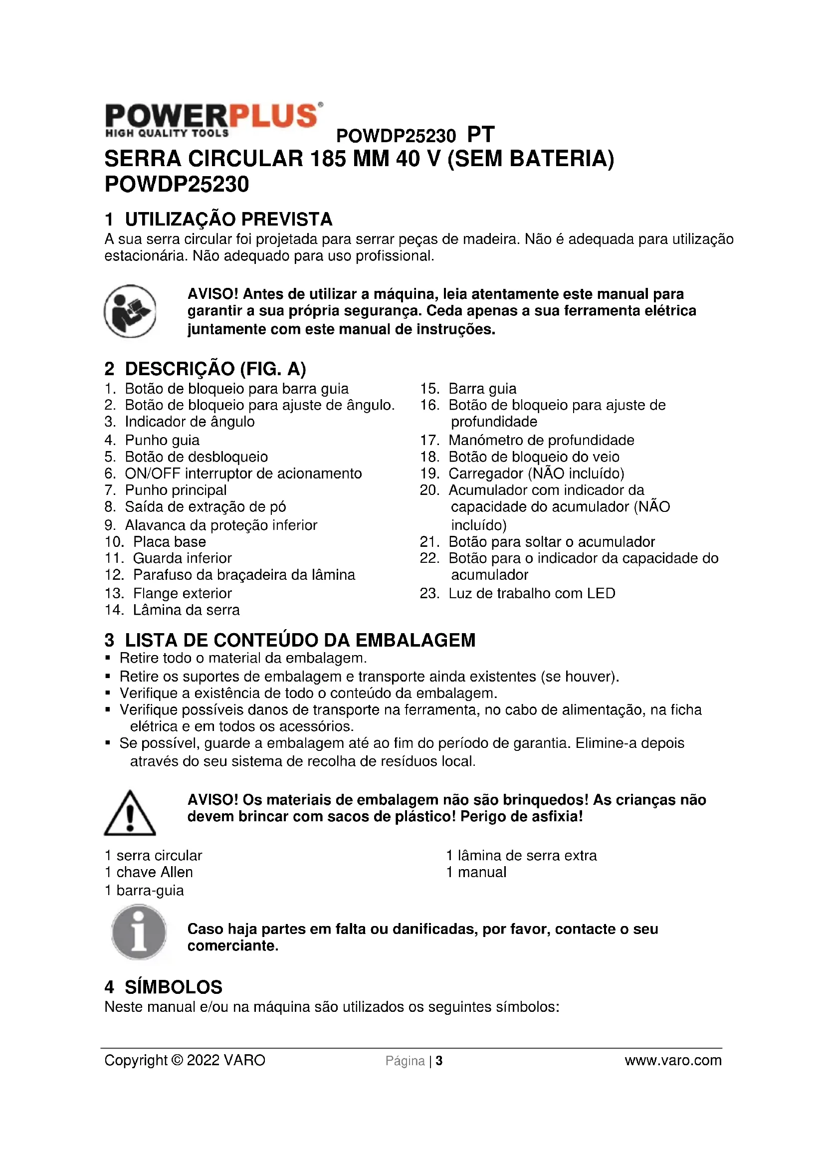 - Se possível, guarde a embalagem até ao fim do período de garantia. Elimine-a depois através do seu sistema de recolha de resíduos local. AVISO! Os materiais de embalagem não são brinquedos! As crianças não devem brincar com sacos de plástico! Perigo de asfixia! 1 serra circular 1 chave Allen 1 barra-guia 1 lâmina de serra extra 1 manual Caso haja partes em falta ou danificadas, por favor, contacte o seu comerciante. 4 SÍMBOLOS Neste manual e/ou na máquina são utilizados os seguintes símbolos:POWDP25230 PT Copyright © 2022 VARO Página | 4 www.varo.com