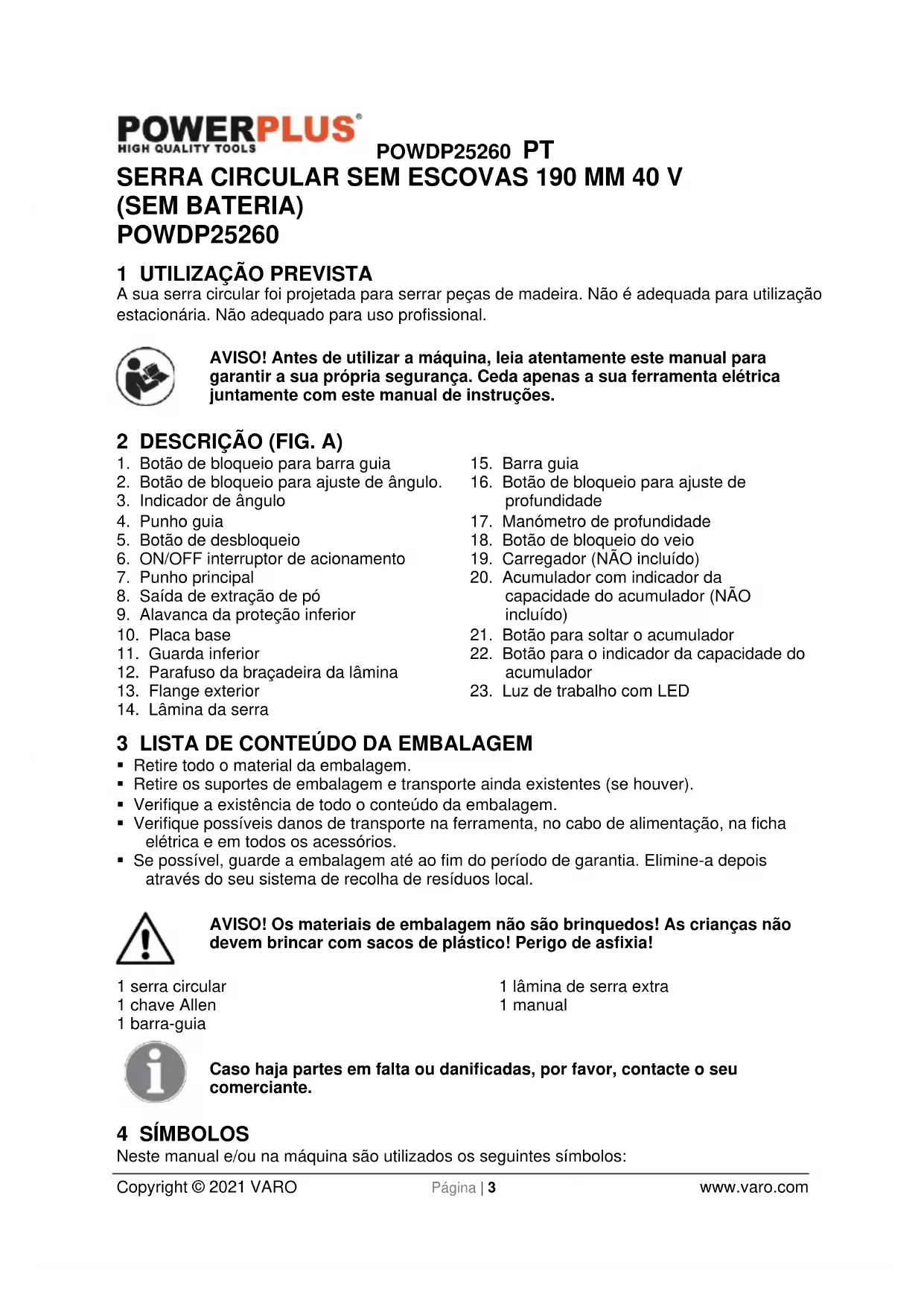 - Se possível, guarde a embalagem até ao fim do período de garantia. Elimine-a depois através do seu sistema de recolha de resíduos local. AVISO! Os materiais de embalagem não são brinquedos! As crianças não devem brincar com sacos de plástico! Perigo de asfixia! 1 serra circular 1 chave Allen 1 barra-guia 1 lâmina de serra extra 1 manual Caso haja partes em falta ou danificadas, por favor, contacte o seu comerciante. 4 SÍMBOLOS Neste manual e/ou na máquina são utilizados os seguintes símbolos:POWDP25260 PT Copyright © 2021 VARO Página | 4 www.varo.com