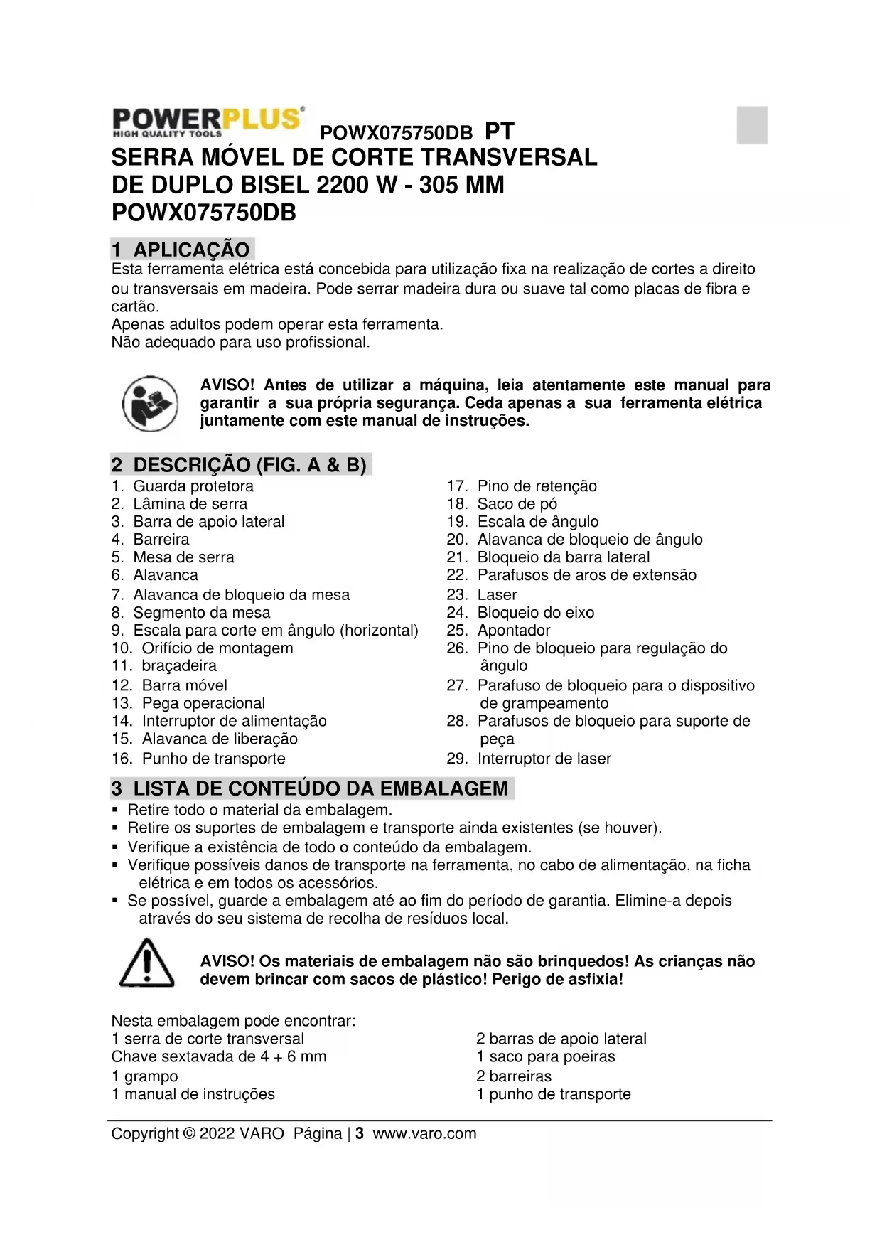 - Se possível, guarde a embalagem até ao fim do período de garantia. Elimine-a depois através do seu sistema de recolha de resíduos local. AVISO! Os materiais de embalagem não são brinquedos! As crianças não devem brincar com sacos de plástico! Perigo de asfixia! Nesta embalagem pode encontrar: 1 serra de corte transversal Chave sextavada de 4 + 6 mm 1 grampo 1 manual de instruções 2 barras de apoio lateral 1 saco para poeiras 2 barreiras 1 punho de transportePOWX075750DB PT Copyright © 2022 VARO Página | 4 www.varo.com Caso haja partes em falta ou danificadas, por favor, contacte o seu comerciante. 4 SÍMBOLOS Neste manual e/ou na máquina são utilizados os seguintes símbolos: