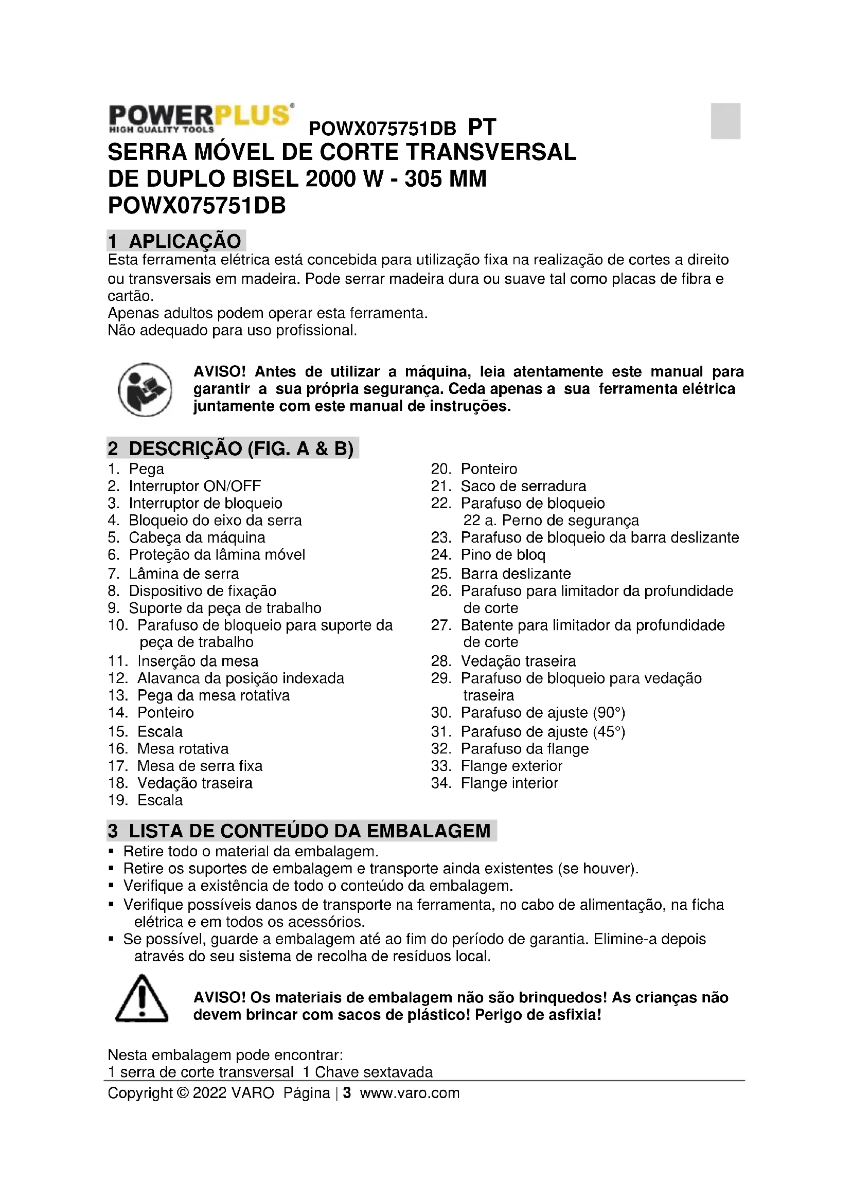 - Se possível, guarde a embalagem até ao fim do período de garantia. Elimine-a depois através do seu sistema de recolha de resíduos local. AVISO! Os materiais de embalagem não são brinquedos! As crianças não devem brincar com sacos de plástico! Perigo de asfixia! Nesta embalagem pode encontrar: 1 serra de corte transversal 1 Chave sextavadaPOWX075751DB PT Copyright © 2022 VARO Página | 4 www.varo.com 1 grampo 1 manual de instruções 2 barras de apoio lateral 1 saco para poeiras 1 Lâmina de serra: Ø 305 x 30 x 2,8mm (40T) Caso haja partes em falta ou danificadas, por favor, contacte o seu comerciante. 4 SÍMBOLOS Neste manual e/ou na máquina são utilizados os seguintes símbolos: