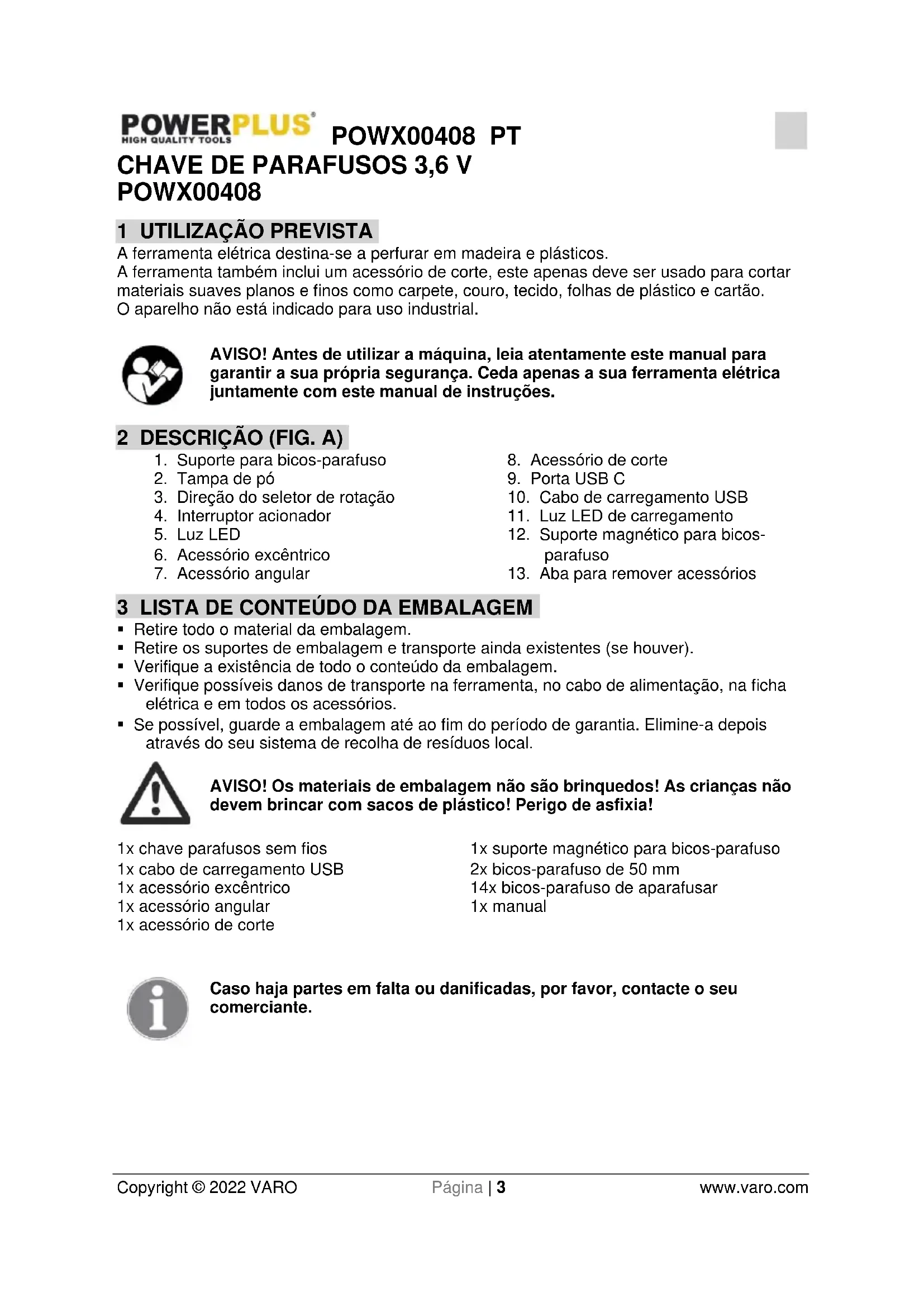 - Utilize a ferramenta elétrica, acessórios, ferramentas normalizadas, etc. de acordo com estas instruções para este tipo especial de aparelho. Tenha também em atenção asPOWX00408 PT Copyright © 2022 VARO Página | 6 www.varo.com condições a trabalhar e a tarefa a executar. O emprego das ferramentas elétricas para aplicações diferentes das estipuladas pode desencadear situações de perigo.