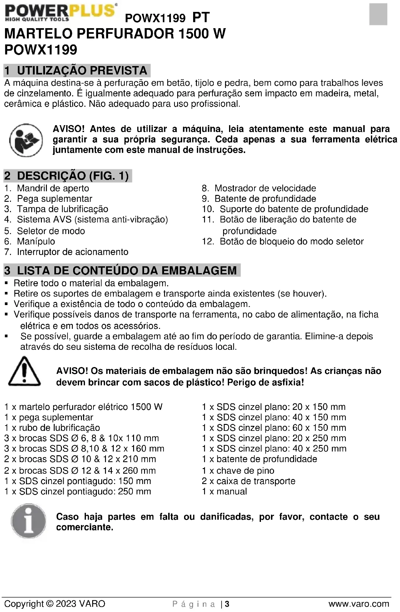 - Se possível, guarde a embalagem até ao fim do período de garantia. Elimine-a depois através do seu sistema de recolha de resíduos local. AVISO! Os materiais de embalagem não são brinquedos! As crianças não devem brincar com sacos de plástico! Perigo de asfixia! 1 x martelo perfurador elétrico 1500 W 1 x pega suplementar 1 x rubo de lubrificação 3 x brocas SDS Ø 6, 8 & 10x 110 mm 3 x brocas SDS Ø 8,10 & 12 x 160 mm 2 x brocas SDS Ø 10 & 12 x 210 mm 2 x brocas SDS Ø 12 & 14 x 260 mm 1 x SDS cinzel pontiagudo: 150 mm 1 x SDS cinzel pontiagudo: 250 mm 1 x SDS cinzel plano: 20 x 150 mm 1 x SDS cinzel plano: 40 x 150 mm 1 x SDS cinzel plano: 60 x 150 mm 1 x SDS cinzel plano: 20 x 250 mm 1 x SDS cinzel plano: 40 x 250 mm 1 x batente de profundidade 1 x chave de pino 2 x caixa de transporte 1 x manual Caso haja partes em falta ou danificadas, por favor, contacte o seu comerciante.POWX1199 PT Copyright © 2023 VARO P á g i n a | 4 www.varo.com 4 SÍMBOLOS Neste manual e/ou na máquina são utilizados os seguintes símbolos: