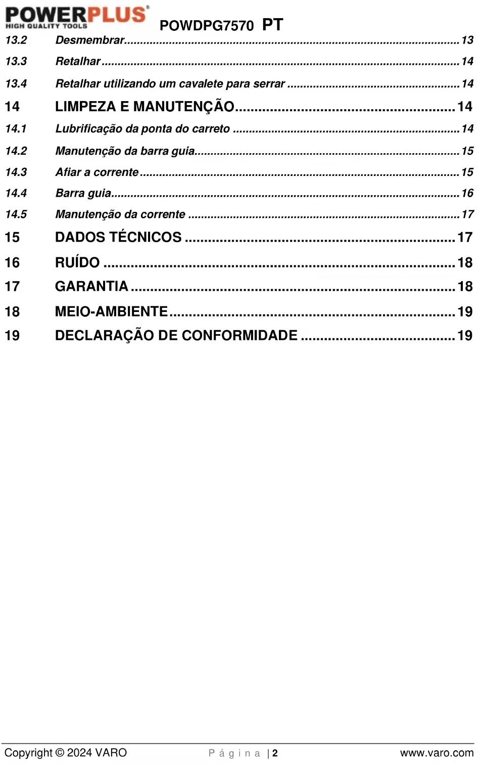 - Mantenha todas as partes do corpo afastadas da motosserra enquanto o motor estiver a funcionar.POWDPG7570 PT Copyright © 2024 VARO P á g i n a | 7 www.varo.com