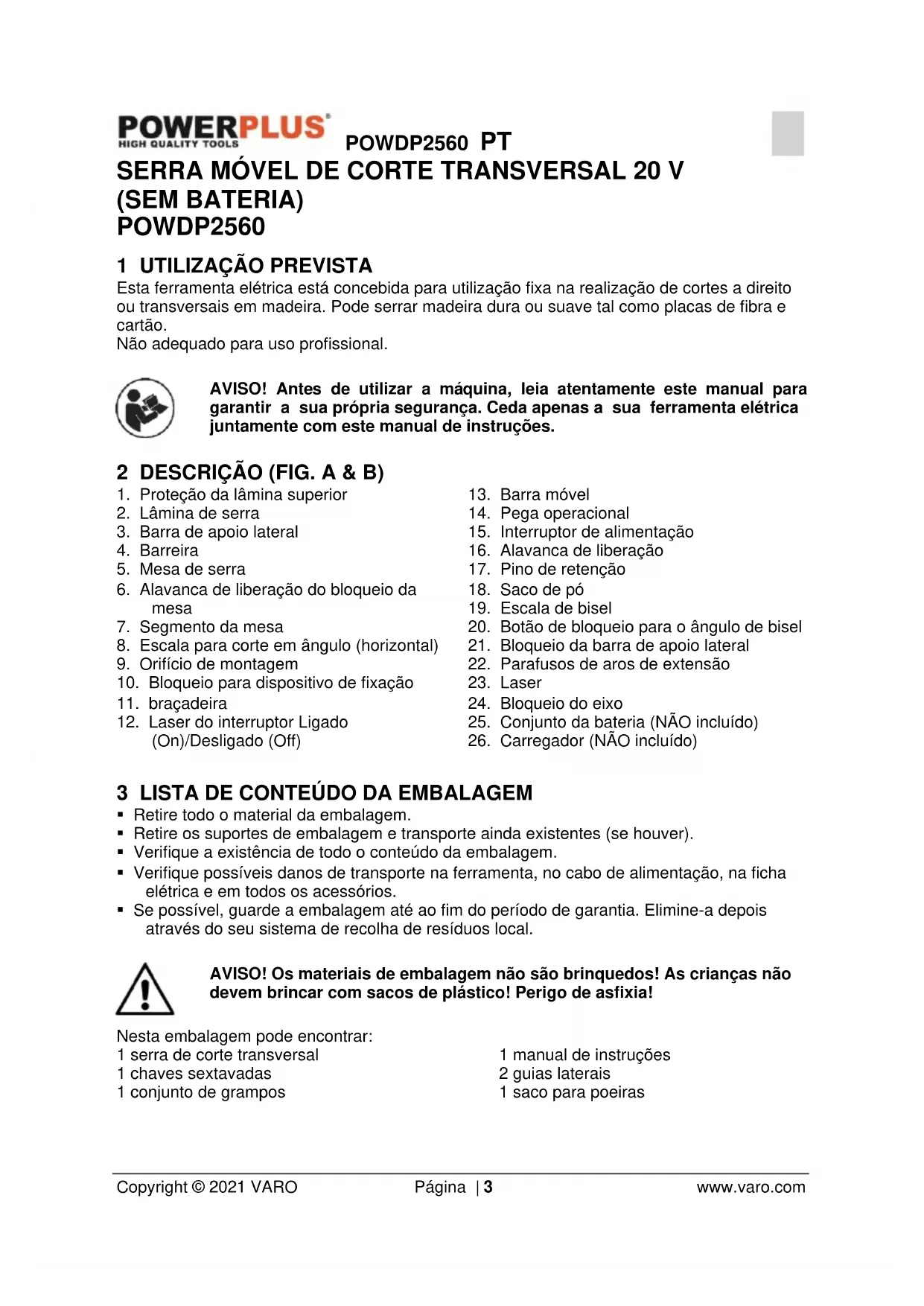 - Se possível, guarde a embalagem até ao fim do período de garantia. Elimine-a depois através do seu sistema de recolha de resíduos local. AVISO! Os materiais de embalagem não são brinquedos! As crianças não devem brincar com sacos de plástico! Perigo de asfixia! Nesta embalagem pode encontrar: 1 serra de corte transversal 1 chaves sextavadas 1 conjunto de grampos 1 manual de instruções 2 guias laterais 1 saco para poeirasPOWDP2560 PT Copyright © 2021 VARO Página | 4 www.varo.com Caso haja partes em falta ou danificadas, por favor, contacte o seu comerciante. 4 SÍMBOLOS Neste manual e/ou na máquina são utilizados os seguintes símbolos: