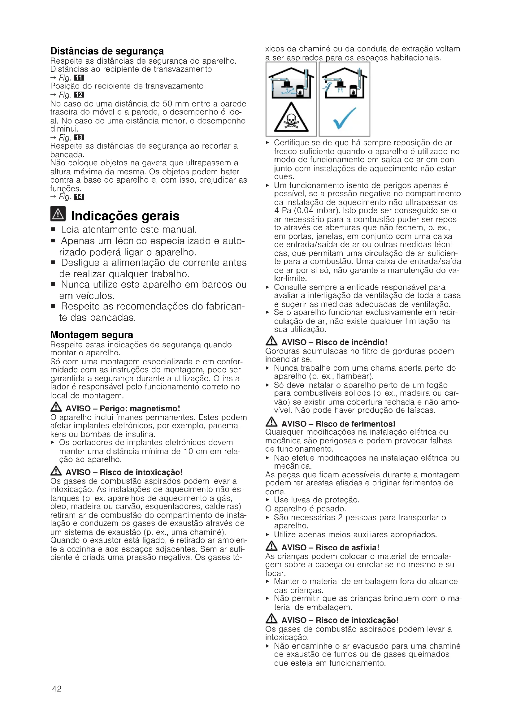 Indicações gerais ¡ Leia atentamente este manual. ¡ Apenas um técnico especializado e auto- rizado poderá ligar o aparelho. ¡ Desligue a alimentação de corrente antes de realizar qualquer trabalho. ¡ Nunca utilize este aparelho em barcos ou em veículos. ¡ Respeite as recomendações do fabrican- te das bancadas. Montagem segura Respeite estas indicações de segurança quando montar o aparelho. Só com uma montagem especializada e em confor- midade com as instruções de montagem, pode ser garantida a segurança durante a utilização. O insta- lador é responsável pelo funcionamento correto no local de montagem. AVISO‒Perigo: magnetismo! O aparelho inclui ímanes permanentes. Estes podem afetar implantes eletrónicos, por exemplo, pacema- kers ou bombas de insulina. ▶ Os portadores de implantes eletrónicos devem manter uma distância mínima de 10cm em rela- ção ao aparelho. AVISO‒Risco de intoxicação! Os gases de combustão aspirados podem levar a intoxicação. As instalações de aquecimento não es- tanques (p. ex. aparelhos de aquecimento a gás, óleo, madeira ou carvão, esquentadores, caldeiras) retiram ar de combustão do compartimento de insta- lação e conduzem os gases de exaustão através de um sistema de exaustão (p. ex., uma chaminé). Quando o exaustor está ligado, é retirado ar ambien- te à cozinha e aos espaços adjacentes. Sem ar sufi- ciente é criada uma pressão negativa. Os gases tó- xicos da chaminé ou da conduta de extração voltam a ser aspirados para os espaços habitacionais. ▶ Certifique-se de que há sempre reposição de ar fresco suficiente quando o aparelho é utilizado no modo de funcionamento em saída de ar em con- junto com instalações de aquecimento não estan- ques. ▶ Um funcionamento isento de perigos apenas é possível, se a pressão negativa no compartimento da instalação de aquecimento não ultrapassar os 4 Pa (0,04 mbar). Isto pode ser conseguido se o ar necessário para a combustão puder ser repos- to através de aberturas que não fechem, p. ex., em portas, janelas, em conjunto com uma caixa de entrada/saída de ar ou outras medidas técni- cas, que permitam uma circulação de ar suficien- te para a combustão. Uma caixa de entrada/saída de ar por si só, não garante a manutenção do va- lor-limite. ▶ Consulte sempre a entidade responsável para avaliar a interligação da ventilação de toda a casa e sugerir as medidas adequadas de ventilação. ▶ Se o aparelho funcionar exclusivamente em recir- culação de ar, não existe qualquer limitação na sua utilização. AVISO‒Risco de incêndio! Gorduras acumuladas no filtro de gorduras podem incendiar-se. ▶ Nunca trabalhe com uma chama aberta perto do aparelho (p.ex., flambear). ▶ Só deve instalar o aparelho perto de um fogão para combustíveis sólidos (p. ex., madeira ou car- vão) se existir uma cobertura fechada e não amo- vível. Não pode haver produção de faíscas. AVISO‒Risco de ferimentos! Quaisquer modificações na instalação elétrica ou mecânica são perigosas e podem provocar falhas de funcionamento. ▶ Não efetue modificações na instalação elétrica ou mecânica. As peças que ficam acessíveis durante a montagem podem ter arestas afiadas e originar ferimentos de corte. ▶ Use luvas de proteção. O aparelho é pesado. ▶ São necessárias 2 pessoas para transportar o aparelho. ▶ Utilize apenas meios auxiliares apropriados. AVISO‒Risco de asfixia! As crianças podem colocar o material de embala- gem sobre a cabeça ou enrolar-se no mesmo e su- focar. ▶ Manter o material de embalagem fora do alcance das crianças. ▶ Não permitir que as crianças brinquem com o ma- terial de embalagem. AVISO‒Risco de intoxicação! Os gases de combustão aspirados podem levar a intoxicação. ▶ Não encaminhe o ar evacuado para uma chaminé de exaustão de fumos ou de gases queimados que esteja em funcionamento.43 ▶ Não encaminhe o ar evacuado para uma caixa de ar que sirva para a ventilação de locais com larei- ras instaladas. ▶ Caso o ar evacuado tenha de ser encaminhado para uma chaminé de exaustão de fumos ou de gases queimados que não esteja em funciona- mento, é necessária uma autorização da entidade supervisora da instalação dos aparelhos de quei- ma. Os gases de combustão aspirados podem levar a intoxicação. ▶ Se for instalado um exaustor com instalação de aquecimento não estanque, é necessário munir a alimentação de corrente do exaustor com um cir- cuito de segurança adequado. Indicações relativas à ligação elétrica Para poder efetuar a ligação elétrica do aparelho em segurança, respeite estas indicações. AVISO‒Risco de choque elétrico! Deve existir a possibilidade de desligar o aparelho da rede elétrica em qualquer altura. O aparelho só pode ser ligado a uma tomada de ligação instalada em conformidade com as normas. ▶ Na instalação elétrica fixa é necessário montar um dispositivo de seccionamento omnipolar em con- formidade com as condições da categoria de so- bretensão III e com as regras de instalação. ▶ Apenas um eletricista pode efetuar a instalação elétrica fixa. Recomendamos a instalação de um disjuntor diferencial (interruptor de corrente dife- rencial residual) no circuito de corrente da alimen- tação do aparelho. ¡ Não dobre nem entale o cabo de ligação e man- tenha-o afastado de arestas afiadas. ¡ Instale o cabo de ligação de forma a que não to- que em partes quentes do aparelho. ¡ Utilize apenas o cabo de ligação fornecido junta- mente com o aparelho ou pela Assistência técni- ca. ¡ Este aparelho corresponde às determinações da UE sobre supressão de interferências. ¡ O aparelho corresponde à classe de proteção 1 e só pode ser usado com uma ligação com condu- tor de proteção. ¡ O fabricante não assume qualquer responsabilida- de por anomalias de funcionamento ou possíveis danos causados por um