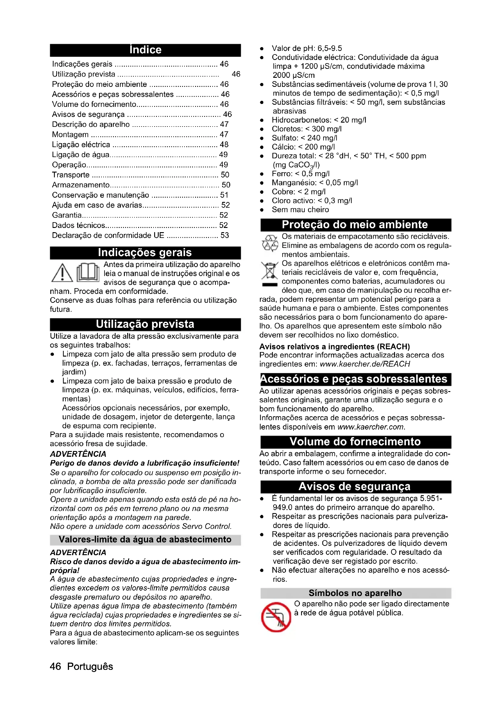 /l) ● Ferro: < 0,5 mg/l ● Manganésio: < 0,05 mg/l ● Cobre: < 2 mg/l ● Cloro activo: < 0,3 mg/l ● Sem mau cheiro Proteção do meio ambiente Os materiais de empacotamento são recicláveis. Elimine as embalagens de acordo com os regula- mentos ambientais. Os aparelhos elétricos e eletrónicos contêm ma- teriais recicláveis de valor e, com frequência, componentes como baterias, acumuladores ou óleo que, em caso de manipulação ou recolha er- rada, podem representar um potencial perigo para a saúde humana e para o ambiente. Estes componentes são necessários para o bom funcionamento do apare- lho. Os aparelhos que apresentem este símbolo não devem ser recolhidos no lixo doméstico. Avisos relativos a ingredientes (REACH) Pode encontrar informações actualizadas acerca dos ingredientes em: www.kaercher.de/REACH Acessórios e peças sobressalentes Ao utilizar apenas acessórios originais e peças sobres- salentes originais, garante uma utilização segura e o bom funcionamento do aparelho. Informações acerca de acessórios e peças sobressa- lentes disponíveis em www.kaercher.com. Volume do fornecimento Ao abrir a embalagem, confirme a integralidade do con- teúdo. Caso faltem acessórios ou em caso de danos de transporte informe o seu fornecedor. Avisos de segurança ● É fundamental ler os avisos de segurança 5.951-