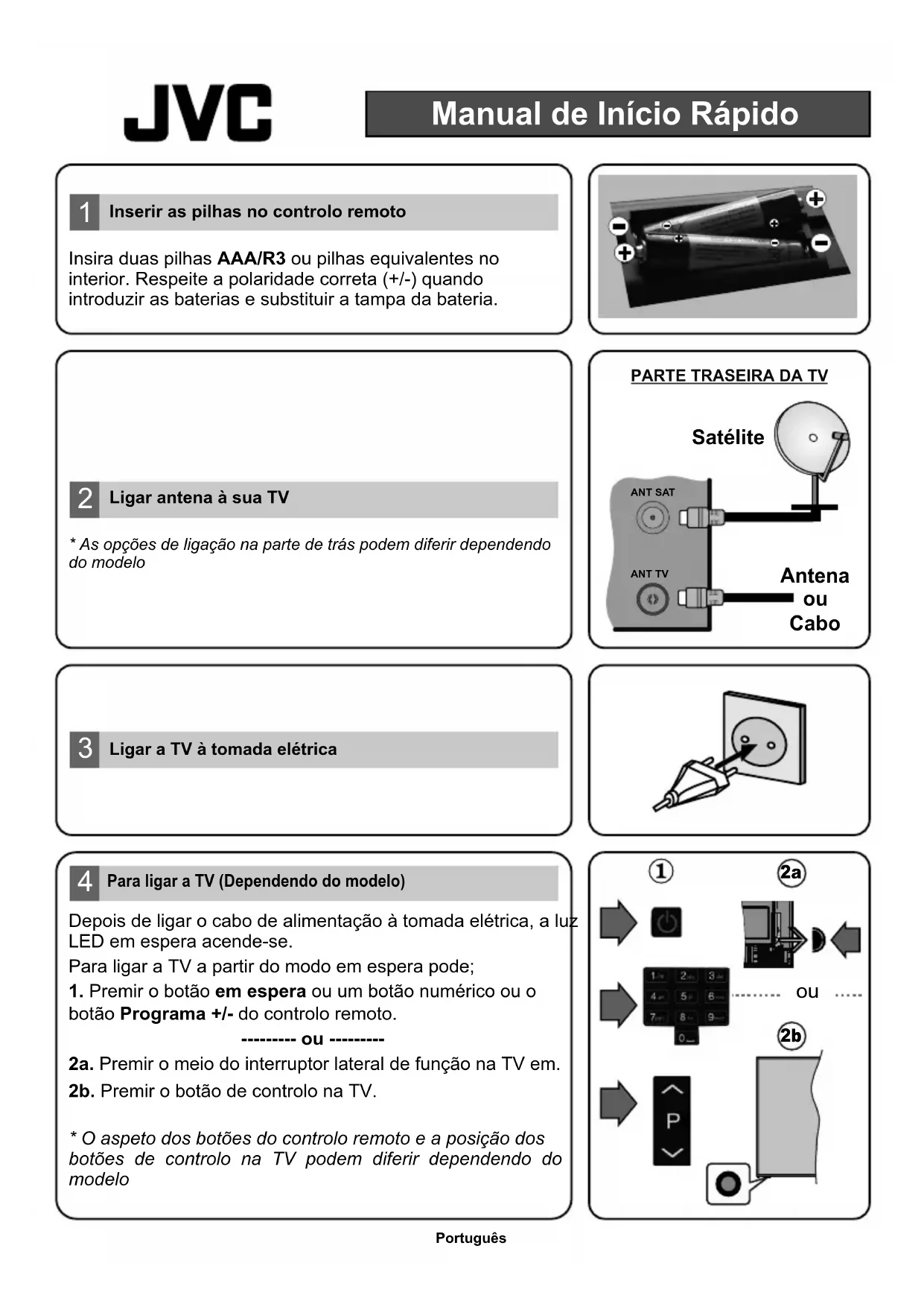 - As opções de ligação na parte de trás podem diferir dependendo do modelo1. Premir o botão em espera ou um botão numérico ou o botão Programa +/- do controlo remoto.2a. Premir o meio do interruptor lateral de função na TV em.* O aspeto dos botões do controlo remoto e a posição dos botões de controlo na TV podem diferir dependendo do modeloPara ligar a TV a partir do modo em espera pode;--------- ou ---------Depois de ligar o cabo de alimentação à tomada elétrica, a luz LED em espera acende-se.2b. Premir o botão de controlo na TV.Para ligar a TV (Dependendo do modelo)