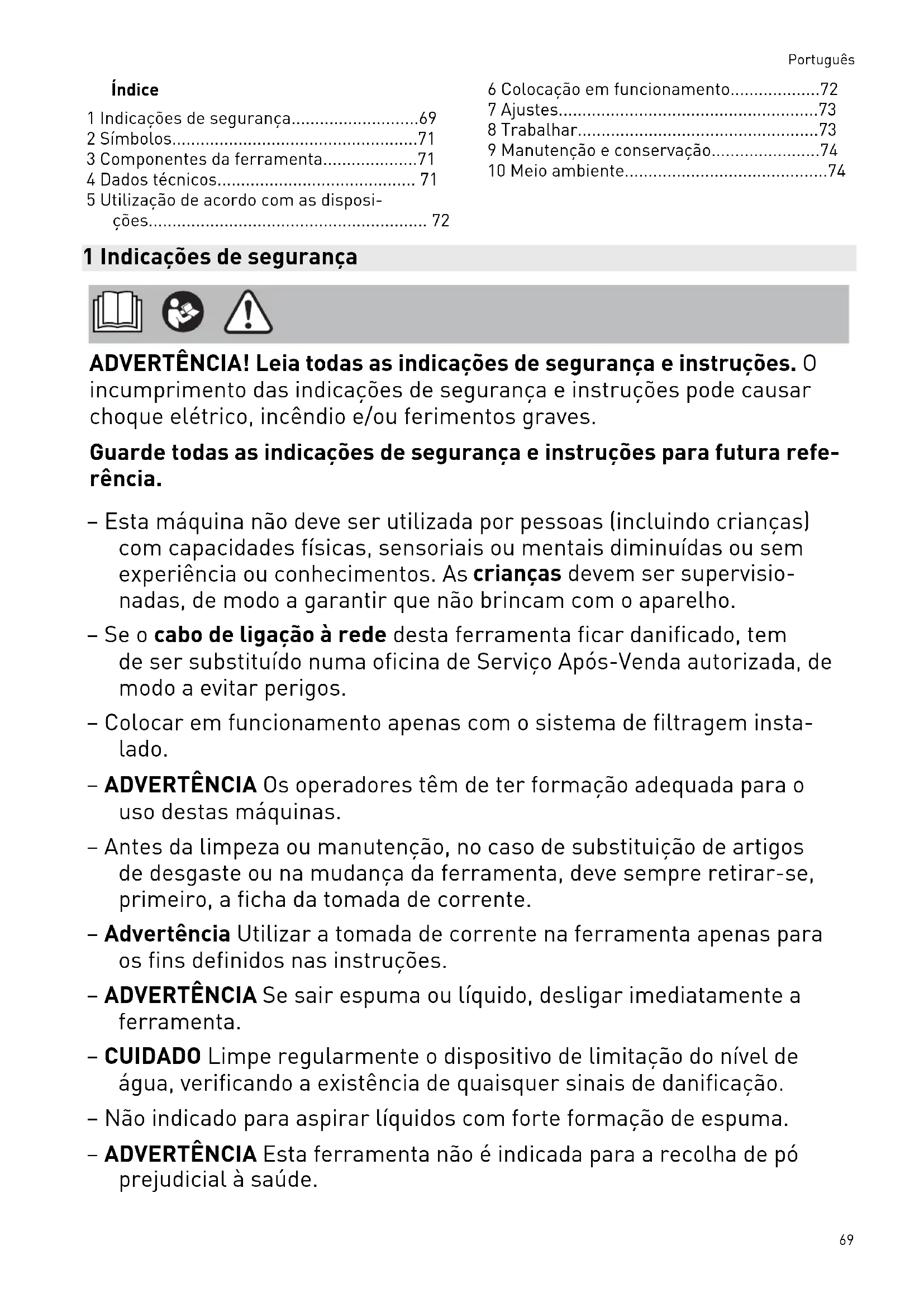 CUIDADO Pós prejudiciais à saúde Lesão das vias respiratórias ► Após a aspiração a húmido, remover o filtro para líquidos e substituí-lo pelo filtro principal para materiais secos.