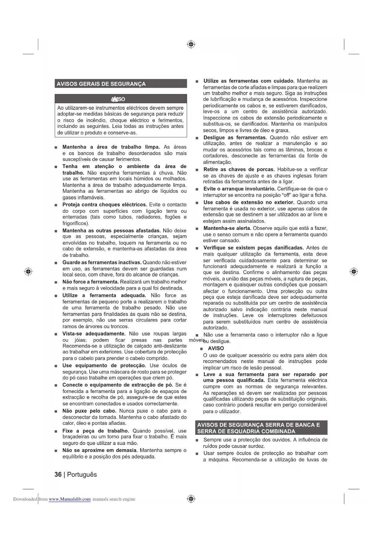 AVISO Ao utilizarem-se instrumentos eléctricos devem sempre adoptar-se medidas básicas de segurança para reduzir o risco de incêndio, choque eléctrico e ferimentos, incluindo as seguintes. Leia todas as instruções antes de utilizar o produto e conserve-as. Ŷ Mantenha a área de trabalho limpa. As áreas e os bancos de trabalho desordenados são mais susceptíveis de causar ferimentos. Ŷ Tenha em atenção o ambiente da área de trabalho. Não exponha ferramentas à chuva. Não use as ferramentas em locais húmidos ou molhados. Mantenha a área de trabalho adequadamente limpa. Mantenha as ferramentas ao abrigo de líquidos ou gases inflamáveis. Ŷ Proteja contra choques eléctricos. Evite o contacto do corpo com superfícies com ligação terra ou enterradas (tais como tubos, radiadores, fogões e frigoríficos). Ŷ Mantenha as outras pessoas afastadas. Não deixe que as pessoas, especialmente crianças, sejam envolvidas no trabalho, toquem na ferramenta ou no cabo de extensão, e mantenha-as afastadas da área de trabalho. Ŷ Guarde as ferramentas inactivas. Quando não estiver em uso, as ferramentas devem ser guardadas num local seco, com chave, fora do alcance de crianças. Ŷ Não force a ferramenta. Realizará um trabalho melhor e mais seguro à velocidade para a qual foi destinada. Ŷ Utilize a ferramenta adequada. Não force as ferramentas de pequeno porte a realizarem o trabalho de uma ferramenta de trabalho pesado. Não use ferramentas para finalidades às quais não se destina, por exemplo, não use serras circulares para cortar ramos de árvores ou troncos. Ŷ Vista-se adequadamente. Não use roupas largas RX MyLDV SRGHP ILFDU SUHVDV QDV SDUWHV PyYHLV Recomenda-se a utilização de calçado anti-deslizante ao trabalhar em exteriores. Use cobertura de protecção para o cabelo para prender o cabelo comprido. Ŷ Use equipamento de protecção. Use óculos de segurança. Use uma máscara de rosto para se proteger do pó caso trabalhe em operações que criem pó. Ŷ Conecte o equipamento de extracção de pó. Se é fornecida a ferramenta para a ligação de espaços de extracção e recolha de pó, assegure-se de que estes se encontram conectados e usados correctamente. Ŷ Não puxe pelo cabo. Nunca puxe o cabo para o desconectar da tomada. Mantenha o cabo afastado do calor, óleo e pontas afiadas. Ŷ Fixe a peça de trabalho. Quando possível, use braçadeiras ou um torno para fixar o trabalho. É mais seguro do que utilizar a sua mão. Ŷ Não se aproxime em demasia. Mantenha sempre o equilíbrio e a posição dos pés adequada. Ŷ Utilize as ferramentas com cuidado. Mantenha as ferramentas de corte afiadas e limpas para que realizem um trabalho melhor e mais seguro. Siga as instruções de lubrificação e mudança de acessórios. Inspeccione periodicamente os cabos e, se estiverem danificados, leve-os a um centro de assistência autorizado. Inspeccione os cabos de extensão periodicamente e substitua-os, se danificados. Mantenha os manípulos secos, limpos e livres de óleo e graxa. Ŷ Desligue as ferramentas. Quando não estiver em utilização, antes de realizar a manutenção e ao mudar os acessórios tais como as lâminas, brocas e cortadores, desconecte as ferramentas da fonte de alimentação. Ŷ Retire as chaves de porcas. Habitue-se a verificar se as chaves de ajuste e as chaves inglesas foram retiradas da ferramenta antes de a ligar. Ŷ Evite o arranque involuntário. Certifique-se de que o interruptor se encontra na posição “off” ao ligar a ficha. Ŷ Use cabos de extensão no exterior. Quando uma ferramenta é usada no exterior, use apenas cabos de extensão que se destinem a ser utilizados ao ar livre e estejam assim assinalados. Ŷ Mantenha-se alerta. Observe aquilo que está a fazer, use o senso comum e não opere a ferramenta quando estiver cansado. Ŷ Verifique se existem peças danificadas. Antes de mais qualquer utilização da ferramenta, esta deve ser verificada cuidadosamente para determinar se funcionará adequadamente e realizará a função a que se destina. Confirme o alinhamento das peças móveis, a união das peças móveis, a ruptura de peças, montagem e quaisquer outras condições que possam afectar o funcionamento. Uma protecção ou outra peça que esteja danificada deve ser adequadamente reparada ou substituída por um centro de assistência autorizado salvo indicação contrária neste manual de instruções. Leve os interruptores defeituosos para serem substituídos num centro de assistência autorizado. Ŷ Não use a ferramenta caso o interruptor não a ligue ou desligue. Ŷ AVISO O uso de qualquer acessório ou extra para além dos recomendados neste manual de instruções pode implicar um risco de lesão pessoal. Ŷ Leve a sua ferramenta para ser reparado por uma pessoa qualificada. Esta ferramenta eléctrica cumpre com as normas de segurança relevantes. As reparações só devem ser realizadas por pessoas qualificadas utilizando peças de substituição originais, caso contrário poderá resultar em perigo considerável para o utilizador. AVISOS DE SEGURANÇA SERRA DE BANCA E