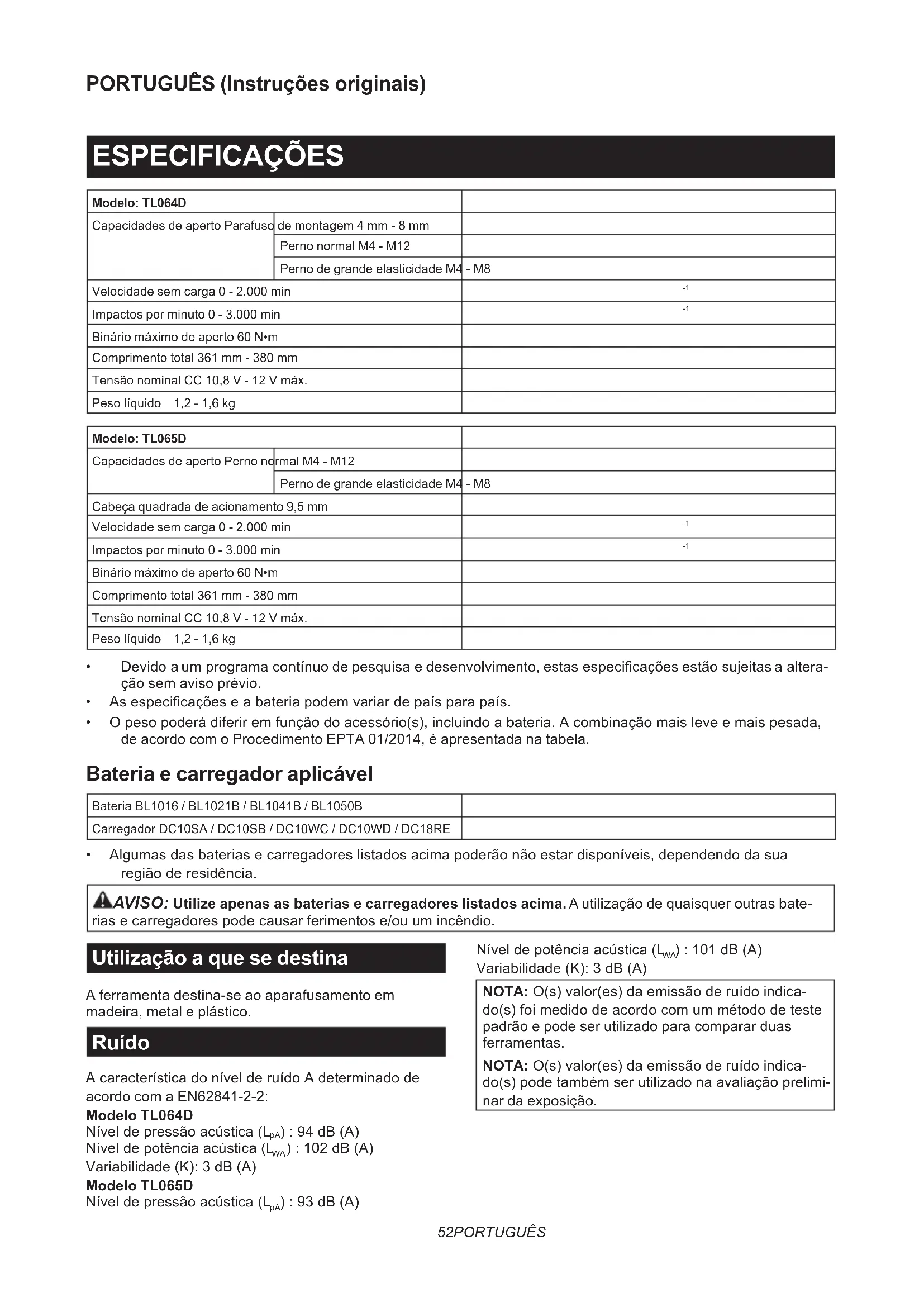 ):101dB(A) Variabilidade(K):3dB(A) NOTA:O(s)valor(es)daemissãoderuídoindica- do(s)foimedidodeacordocomummétododeteste padrão e pode ser utilizado para comparar duas ferramentas. NOTA:O(s)valor(es)daemissãoderuídoindica- do(s)podetambémserutilizadonaavaliaçãoprelimi- nar da exposição.53 PORTUGUÊS AVISO: Utilize protetores auriculares. AVISO: A emissão de ruído durante a utiliza- ção real da ferramenta elétrica pode diferir do(s) valor(es) indicado(s), dependendo das formas como a ferramenta é utilizada, especialmente o tipo de peça de trabalho que é processada. AVISO: Certique-se de identicar as medidas de segurança para proteção do operador que sejam baseadas em uma estimativa de exposição em condições reais de utilização (considerando todas as partes do ciclo de operação, tal como quando a ferramenta está desligada e quando está a funcionar em marcha lenta além do tempo de acionamento). Vibração Valortotaldavibração(somavetorialtri-axial)determi- nado de acordo com a EN62841-2-2: Modelo TL064D Modo de trabalho: aperto com impacto de parafusos de capacidade máxima da ferramenta Emissãodevibração(a