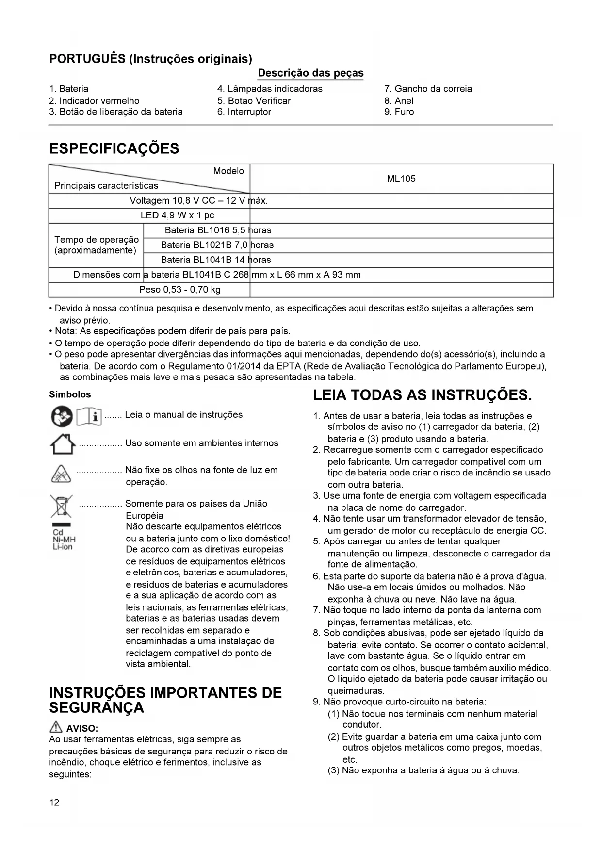 Modelo ML105 Principais características Voltagem 10,8 V CC – 12 V máx. LED 4,9 W x 1 pc Tempo de operação (aproximadamente) Bateria BL1016 5,5 horas Bateria BL1021B 7,0 horas Bateria BL1041B 14 horas Dimensões com a bateria BL1041B C 268 mm x L 66 mm x A 93 mm Peso 0,53 - 0,70 kg13 Um curto-circuito da bateria pode causar um fluxo grande de corrente, superaquecimento, queimaduras ou mesmo falhas.
