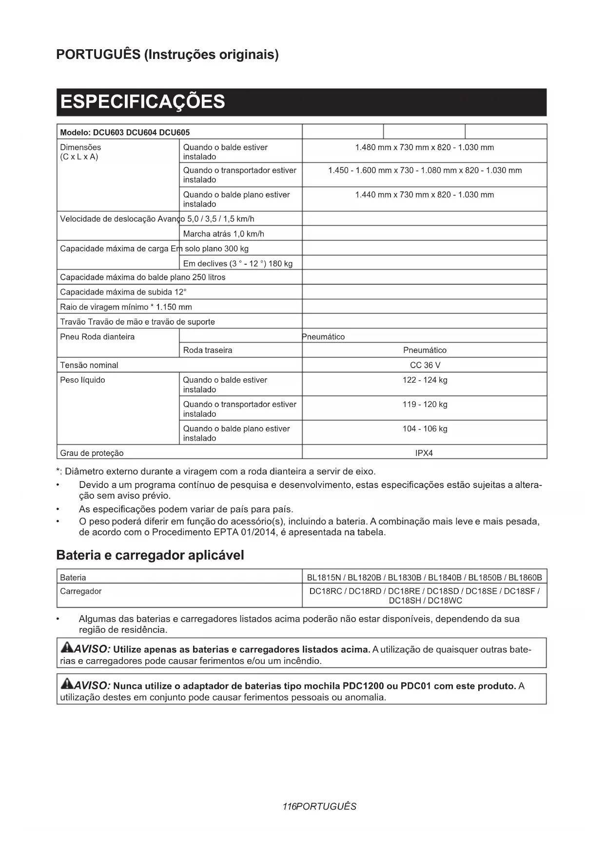 - O peso poderá diferir em função do acessório(s), incluindo a bateria. A combinação mais leve e mais pesada, de acordo com o Procedimento EPTA 01/2014, é apresentada na tabela. Bateria e carregador aplicável Bateria BL1815N / BL1820B / BL1830B / BL1840B / BL1850B / BL1860B Carregador DC18RC / DC18RD / DC18RE / DC18SD / DC18SE / DC18SF / DC18SH / DC18WC