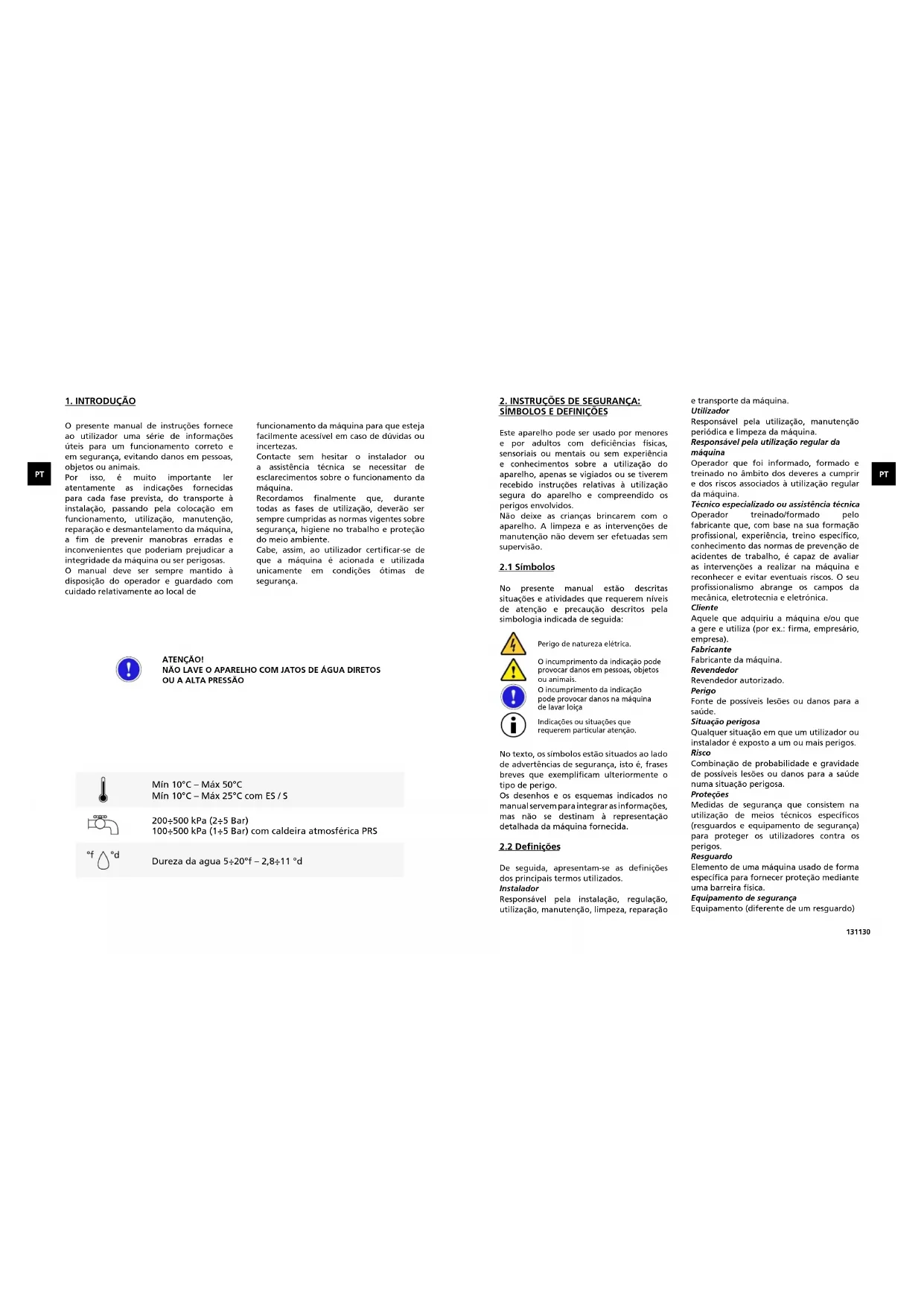 De seguida, apresentam-se as definições dos principais termos utilizados. Instalador Responsável pela instalação, regulação, utilização, manutenção, limpeza, reparação e transporte da máquina. Utilizador Responsável pela utilização, manutenção periódica e limpeza da máquina. Responsável pela utilização regular da máquina Operador que foi informado, formado e treinado no âmbito dos deveres a cumprir e dos riscos associados à utilização regular da máquina. Técnico especializado ou assistência técnica Operador treinado/formado pelo fabricante que, com base na sua formação profissional, experiência, treino específico, conhecimento das normas de prevenção de acidentes de trabalho, é capaz de avaliar as intervenções a realizar na máquina e reconhecer e evitar eventuais riscos. O seu profissionalismo abrange os campos da mecânica, eletrotecnia e eletrónica. Cliente Aquele que adquiriu a máquina e/ou que a gere e utiliza (por ex.: firma, empresário, empresa). Fabricante Fabricante da máquina. Revendedor Revendedor autorizado. Perigo Fonte de possíveis lesões ou danos para a saúde. Situação perigosa Qualquer situação em que um utilizador ou instalador é exposto a um ou mais perigos. Risco Combinação de probabilidade e gravidade de possíveis lesões ou danos para a saúde numa situação perigosa. Proteções Medidas de segurança que consistem na utilização de meios técnicos específicos (resguardos e equipamento de segurança) para proteger os utilizadores contra os perigos. Resguardo Elemento de uma máquina usado de forma específica para fornecer proteção mediante uma barreira física. Equipamento de segurança Equipamento (diferente de um resguardo) Perigo de natureza elétrica. O incumprimento da indicação pode provocar danos em pessoas, objetos ou animais. Indicações ou situações que requerem particular atenção. O incumprimento da indicação pode provocar danos na máquina de lavar loiça133132