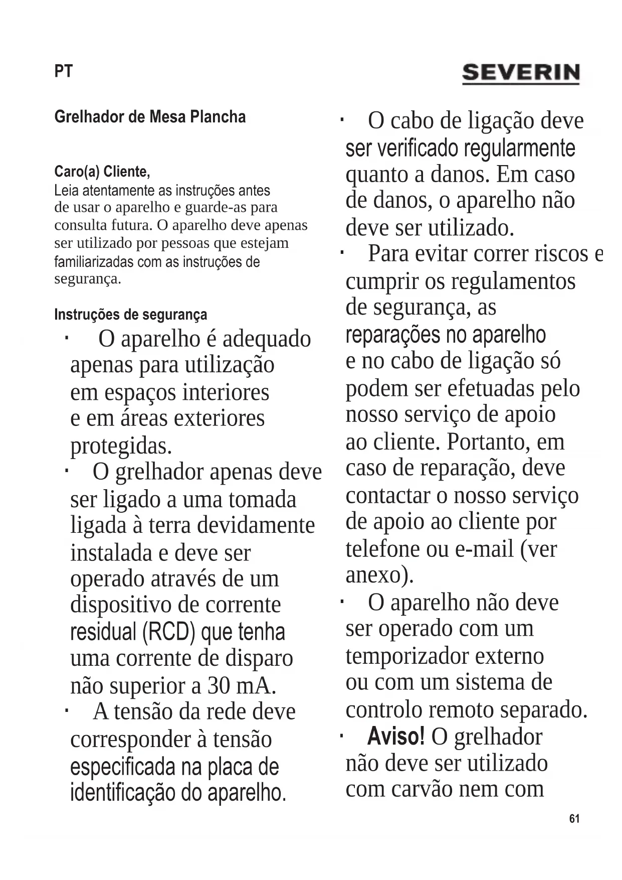 Grelhador de Mesa Plancha Caro(a) Cliente, Leia atentamente as instruções antes de usar o aparelho e guarde-as para consulta futura. O aparelho deve apenas ser utilizado por pessoas que estejam familiarizadas com as instruções de segurança. Instruções de segurança ∙ O aparelho é adequado apenas para utilização em espaços interiores e em áreas exteriores protegidas. ∙ O grelhador apenas deve ser ligado a uma tomada ligada à terra devidamente instalada e deve ser operado através de um dispositivo de corrente residual (RCD) que tenha uma corrente de disparo não superior a 30 mA. ∙ A tensão da rede deve corresponder à tensão especicada na placa de identicação do aparelho. ∙ O cabo de ligação deve ser vericado regularmente quanto a danos. Em caso de danos, o aparelho não deve ser utilizado. ∙ Para evitar correr riscos e cumprir os regulamentos de segurança, as reparações no aparelho e no cabo de ligação só podem ser efetuadas pelo nosso serviço de apoio ao cliente. Portanto, em caso de reparação, deve contactar o nosso serviço de apoio ao cliente por telefone ou e-mail (ver anexo). ∙ O aparelho não deve ser operado com um temporizador externo ou com um sistema de controlo remoto separado. ∙ Aviso! O grelhador não deve ser utilizado com carvão nem com PT62 104 x 142 mm combustíveis similares. ∙ Atenção! Nunca cubra completamente a chapa do grelhador com folha de alumínio, utensílios de grelhar, etc.! Caso contrário, o calor acumula- se e pode destruir o aparelho. ∙ Não derramar quaisquer líquidos no aparelho.