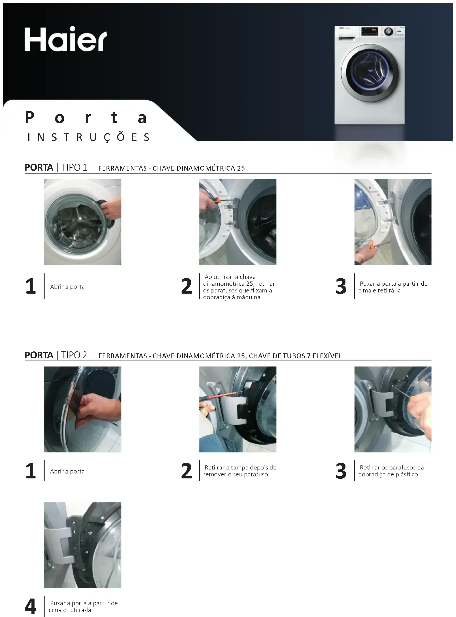 Desengatar a máscara da gaveta de detergente, tendo cuidado para não par r os ganchos Gaveta de detergente INSTRUÇÕES Recomendamos seguir as instruções apresentadas acima. Em caso de dúvida, procurar aconselhamento especializado . A Haier Europe rejeita qualquer responsabilidade por quaisquer danos que possam surgir resultantes do incumprimento das instruções facultadas.FEREASTRA | TIP 1 INSTRUMENTE - CHEIE TORX nr. 25