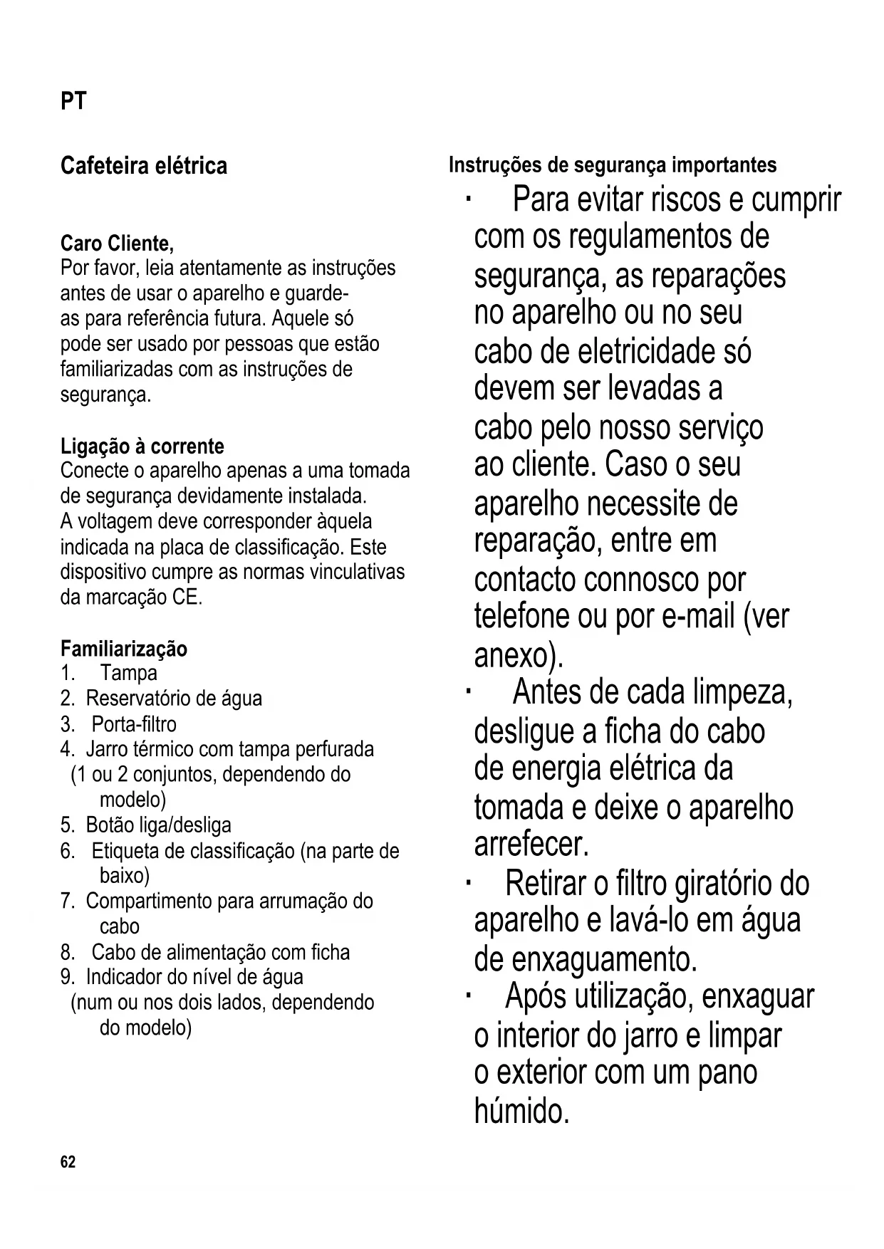 ∙ Para mais detalhes sobre a limpeza, consulte a secção Limpeza e manutenção. ∙ Por razões de segurança elétrica, o aparelho não deve ser limpo com líquidos nem neles imerso. ∙ Aviso! o uso inadequado do aparelho pode resultar em ferimentos! ∙ Cuidado: as superfícies tangíveiscammuito quentes durante e após o uso do aparelho. ∙ O aparelho não deve ser colocado num armário durante a sua utilização. ∙ O aparelho destina-se a ser utilizado em situações domésticas e semelhantes, por exemplo: - em cozinhas para funcionários em lojas, escritórios e outros ambientes de trabalho; - em empresas agrícolas; - por hóspedes em hotéis, motéis e outros ambientes residenciais; - em alojamentos B&B. ∙ O aparelho pode ser utilizado por crianças com mais de 8 anos de idade ou por pessoas com capacidades físicas, sensoriais ou mentais reduzidas ou experiência e/ou conhecimentos insucientes,casosejam supervisionadas ou caso tenham recebido instruções adequadas em relação ao uso seguro do aparelho, compreendendo os perigos associados. ∙ Crianças não devem brincar com o aparelho. ∙ A limpeza e a manutenção não devem ser efetuadas por crianças, a menos que estas tenham 8 anos de idade ou mais e sejam64 104 x 142 mm supervisionadas. ∙ Crianças menores de 8 anos de idade devem ser mantidas longe do aparelho e do cabo elétrico. ∙ Embalagens não são brinquedos para crianças.Existeriscodeasxia! ∙ Antesdeiniciaroaparelho,verique se falta algo no seu corpo ou algum acessório que possa comprometer a segurança do mesmo. Por exemplo, se o aparelho sofreu o impacto de uma queda, pode haver danos que não consiga ver a partir do exterior. Se este for o caso, não utilize o aparelho. ∙ Coloque o aparelho sobre uma superfície plana, antiderrapante e resistente à água. ∙ Certique-sedequeorevestimento do aparelho e o seu cabo elétrico não entram em contacto com um fogão quente ou com uma chama aberta. ∙ Antes de abrir a cafeteira elétrica ou de retiraralgumacessóriodesta,certique- se de que o aparelho desligado já arrefeceu. Caso contrário, pode sair água quente ou emanar vapor. ∙ Nunca deixe o aparelho sem vigilância durante o uso. ∙ Feche sempre o jarro com a tampa perfurada. Não deixe o jarro térmico sem supervisão próximo de crianças. ∙ Retireachadocaboelétricoda tomada: - em caso de falhas durante o funcionamento; - antes de cada limpeza do aparelho; - depois de cada uso. ∙ Nãodesligueachadatomada puxando o cabo elétrico, mas sim segurandoaprópriacha. ∙ Nãotoquenachacomasmãos molhadas. ∙ Não deixe o cabo elétrico pendurado e mantenha-o afastado das partes quentes da cafeteira. ∙ Se o aparelho for operado incorretamenteouparaummque não o recomendado, nenhuma responsabilidade será assumida por qualquer dano que possa ocorrer. Arrumação do cabo O compartimento para arrumação do cabo serve para arrumar o cabo elétrico. Desenrole o cabo até ao comprimento necessário antes da utilização. Desligamento automático Para evitar o desperdício de energia elétrica, o aparelho desligar-se-á automaticamenteapósomdopreparo de café. Antes de utilizar pela primeira vez Antes da primeira preparação de café, execute o processo somente com água fria 2 a 3 vezes, sem café em pó, com o número máximo de chávenas. Repita este processo, caso a cafeteira não tenha sido utilizada por um período prolongado de tempoouapósadescalcicação.104 x 142 mm