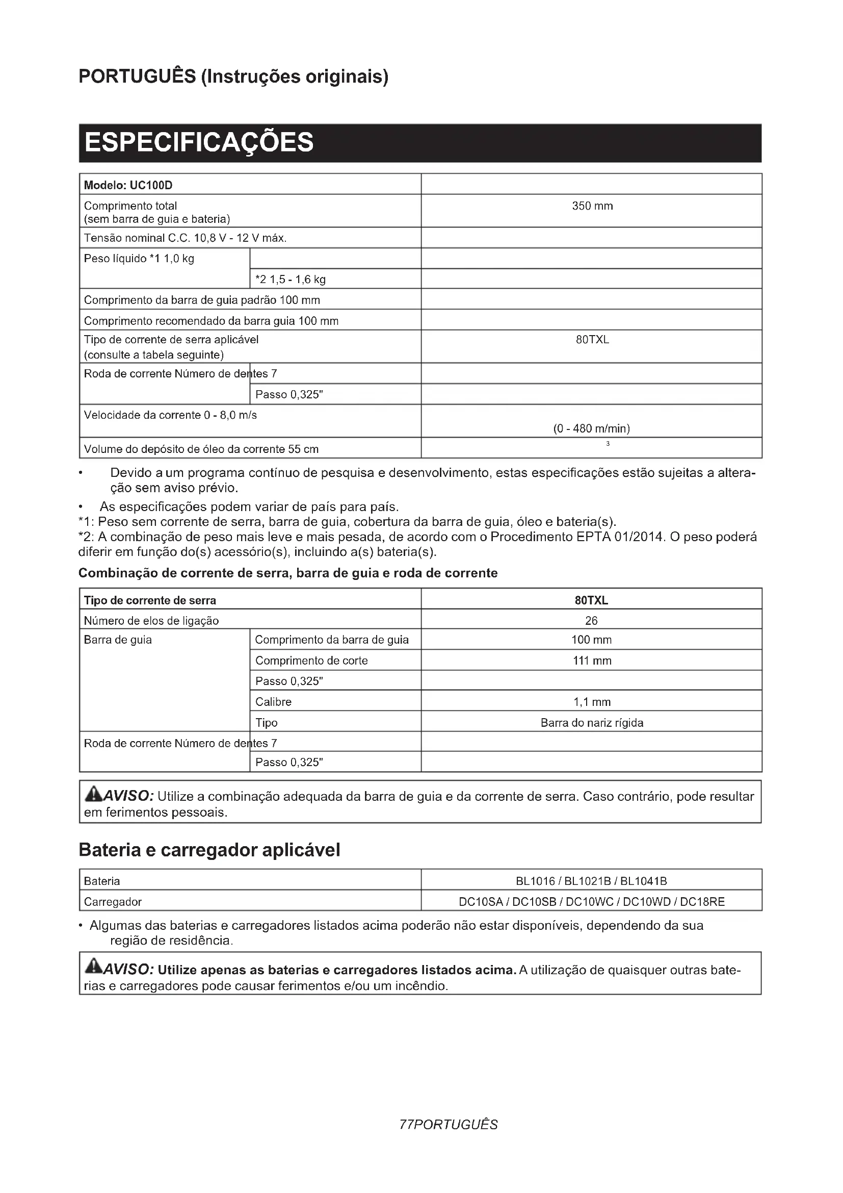 - Asespecicaçõespodemvariardepaísparapaís. *1: Peso sem corrente de serra, barra de guia, cobertura da barra de guia, óleo e bateria(s). *2: A combinação de peso mais leve e mais pesada, de acordo com o Procedimento EPTA 01/2014. O peso poderá diferir em função do(s) acessório(s), incluindo a(s) bateria(s). Combinação de corrente de serra, barra de guia e roda de corrente Tipo de corrente de serra 80TXL Número de elos de ligação 26 Barra de guia Comprimento da barra de guia 100 mm Comprimento de corte 111 mm Passo 0,325" Calibre 1,1 mm Tipo Barra do nariz rígida Roda de corrente Número de dentes 7 Passo 0,325" AVISO: Utilize a combinação adequada da barra de guia e da corrente de serra. Caso contrário, pode resultar em ferimentos pessoais. Bateria e carregador aplicável Bateria BL1016 / BL1021B / BL1041B Carregador DC10SA / DC10SB / DC10WC / DC10WD / DC18RE
