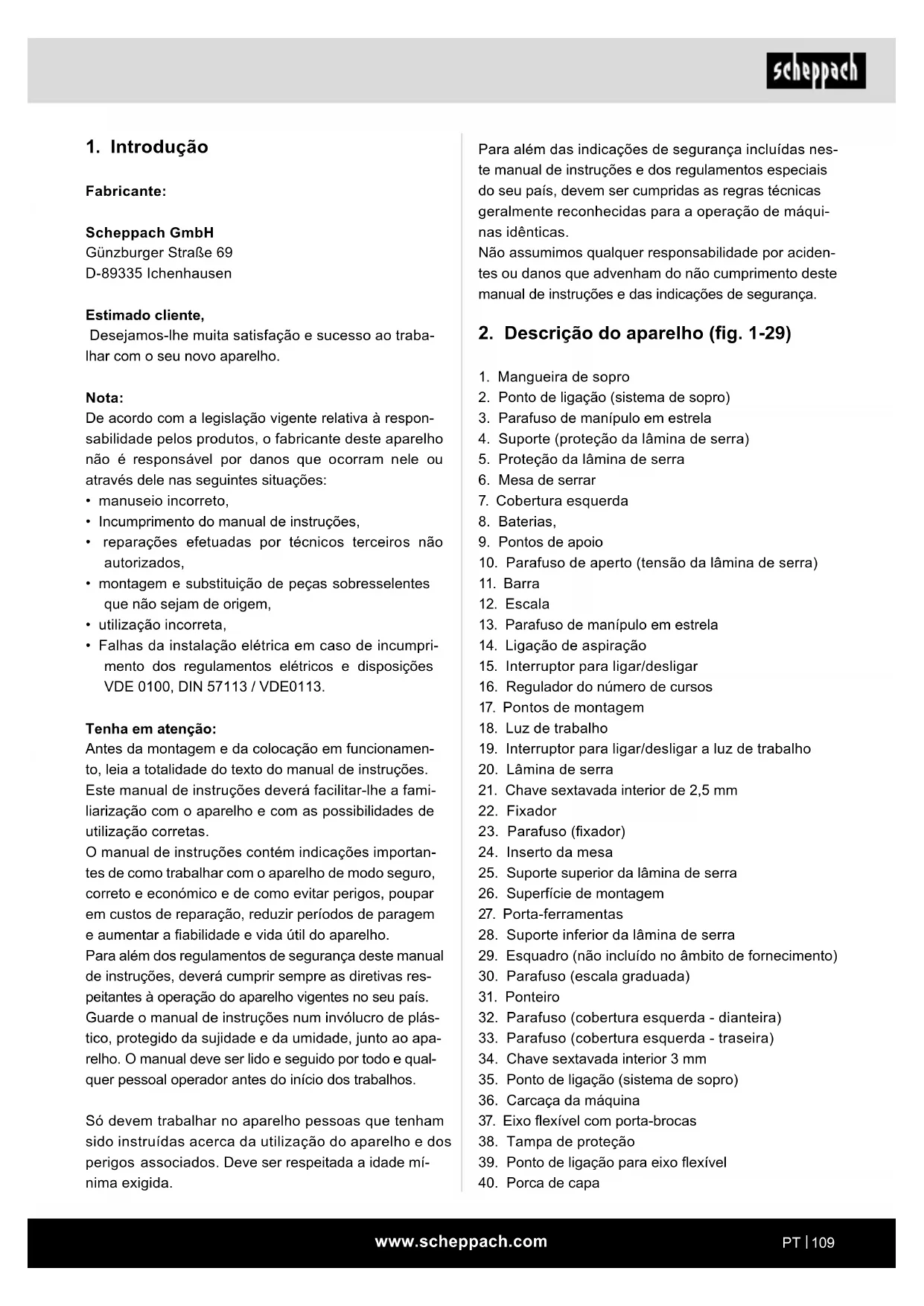 Fabricante: Scheppach GmbH Günzburger Straße 69 D-89335 Ichenhausen Estimado cliente, Desejamos-lhe muita satisfação e sucesso ao traba- lhar com o seu novo aparelho. Nota: De acordo com a legislação vigente relativa à respon- sabilidade pelos produtos, o fabricante deste aparelho não é responsável por danos que ocorram nele ou através dele nas seguintes situações: