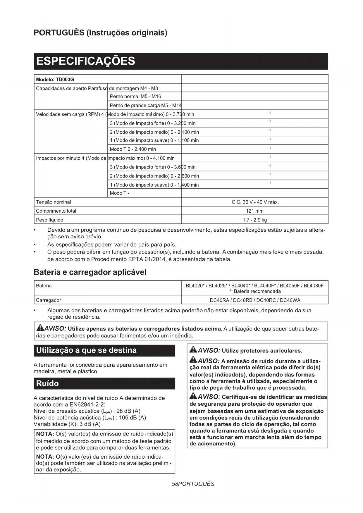 - O peso poderá diferir em função do acessório(s), incluindo a bateria. A combinação mais leve e mais pesada, de acordo com o Procedimento EPTA 01/2014, é apresentada na tabela. Bateria e carregador aplicável Bateria BL4020* / BL4025* / BL4040* / BL4040F* / BL4050F / BL4080F *: Bateria recomendada Carregador DC40RA / DC40RB / DC40RC / DC40WA