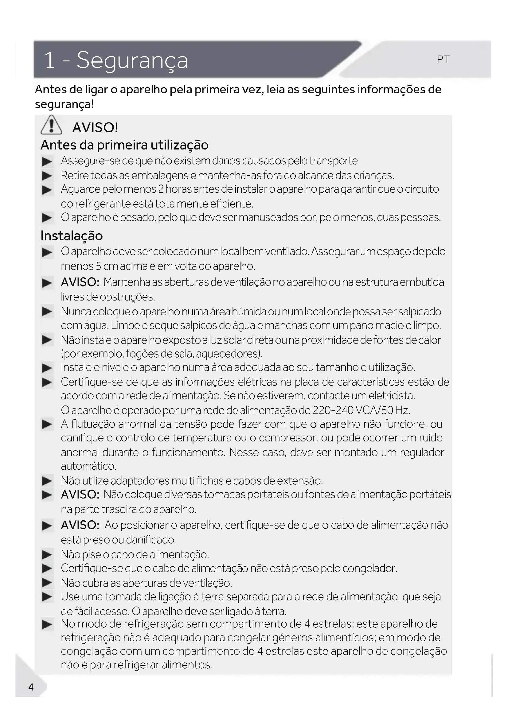 Antes de ligar o aparelho pela primeira vez, leia as seguintes informações desegurança! AVISO! Antes da primeira utilização Assegure-se de que não existem danos causados pelo transporte. Retire todas as embalagens e mantenha-as fora do alcance das crianças. Aguarde pelo menos 2 horas antes de instalar o aparelho para garantir que o circuito do refrigerante está totalmente eƪciente. O aparelho é pesado, pelo que deve ser manuseados por, pelo menos, duas pessoas. Instalação O aparelho deve ser colocado num local bem ventilado. Assegurar um espaço de pelo menos 5 cm acima e em volta do aparelho. AVISO: Mantenha as aberturas de ventilação no aparelho ou na estrutura embutida livres de obstruções. Nunca coloque o aparelho numa área húmida ou num local onde possa ser salpicado com água. Limpe e seque salpicos de água e manchas com um pano macio e limpo. Não instale o aparelho exposto a luz solar direta ou na proximidade de fontes de calor (por exemplo, fogões de sala, aquecedores). Instale e nivele o aparelho numa área adequada ao seu tamanho e utilização. Certiƪque-se de que as informações elétricas na placa de características estão de acordo com a rede de alimentação. Se não estiverem, contacte um eletricista. O aparelho é operado por uma rede de alimentação de 220-240 VCA/50 Hz. A ƫutuação anormal da tensão pode fazer com que o aparelho não funcione, ou daniƪque o controlo de temperatura ou o compressor, ou pode ocorrer um ruído anormal durante o funcionamento. Nesse caso, deve ser montado um regulador automático. Não utilize adaptadores multi ƪchas e cabos de extensão. AVISO: Não coloque diversas tomadas portáteis ou fontes de alimentação portáteis na parte traseira do aparelho. AVISO: Ao posicionar o aparelho, certiƪque-se de que o cabo de alimentação não está preso ou daniƪcado. Não pise o cabo de alimentação. Certiƪque-se que o cabo de alimentação não está preso pelo congelador. Não cubra as aberturas de ventilação. Use uma tomada de ligação à terra separada para a rede de alimentação, que seja de fácil acesso. O aparelho deve ser ligado à terra.