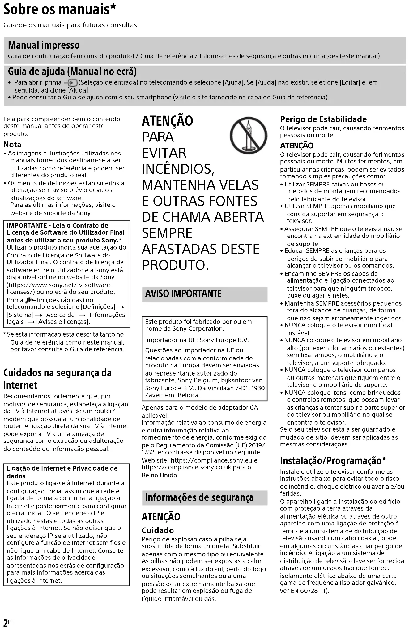 SEMPRE AFASTADAS DESTE PRODUTO. Apenas para o modelo de adaptador CA aplicável:Informação relativa ao consumo de energia e outra informação relativa ao fornecimento de energia, conforme exigido pelo Regulamento da Comissão (UE) 2019/1782, encontra-se disponível no seguinte Web site: https://compliance.sony.eu ehttps://compliance.sony.co.uk para o Reino Unido ATENÇÃO Cuidado Perigo de explosão caso a pilha seja substituída de forma incorreta. Substituir apenas com o mesmo tipo ou equivalente.As pilhas não podem ser expostas a calor excessivo, como à luz do sol, perto do fogo ou situações semelhantes ou a uma pressão de ar extremamente baixa que pode resultar em explosão ou fuga de líquido inflamável ou gás. Perigo de Estabilidade O televisor pode cair, causando ferimentos pessoais ou morte. ATENÇÃO O televisor pode cair, causando ferimentos pessoais ou morte. Muitos ferimentos, em particular nas crianças, podem ser evitados tomando simples precauções como:• Utilizar SEMPRE caixas ou bases ou métodos de montagem recomendados pelo fabricante do televisor.• Utilizar SEMPRE apenas mobiliário que consiga suportar em segurança o televisor.• Assegurar SEMPRE que o televisor não se encontra na extremidade do mobiliário de suporte.• Educar SEMPRE as crianças para os perigos de subir ao mobiliário para alcançar o televisor ou os comandos.• Encaminhe SEMPRE os cabos de alimentação e ligação conectados ao televisor para que ninguém tropece, puxe ou agarre neles.• Mantenha SEMPRE acessórios pequenos fora do alcance de crianças, de forma que não sejam erroneamente ingeridos.• NUNCA coloque o televisor num local instável.• NUNCA coloque o televisor em mobiliário alto (por exemplo, armários ou estantes) sem fixar ambos, o mobiliário e o televisor, a um suporte adequado.• NUNCA coloque o televisor com panos ou outros materiais que fiquem entre o televisor e o mobiliário de suporte.• NUNCA coloque itens, como brinquedos e controlos remotos, que possam levar as crianças a tentar subir à parte superior do televisor ou mobiliário no qual se encontra o televisor.Se o seu televisor está a ser guardado e mudado de sítio, devem ser aplicadas as mesmas considerações. Instalação/Programação* Instale e utilize o televisor conforme as instruções abaixo para evitar todo o risco de incêndio, choque elétrico ou avaria e/ou feridas.O aparelho ligado à instalação do edifício com proteção à terra através da alimentação elétrica ou através de outro aparelho com uma ligação de proteção à terra - e a um sistema de distribuição de televisão usando um cabo coaxial, pode em algumas circunstâncias criar perigo de incêndio. A ligação a um sistema de distribuição de televisão deve ser fornecida através de um dispositivo que fornece isolamento elétrico abaixo de uma certa gama de frequência (isolador galvânico, ver EN 60728-11). Sobre os manuais* Guarde os manuais para futuras consultas. Manual impresso Guia de configuração (em cima do produto) / Guia de referência / Informações de segurança e outras informações (este manual). Guia de ajuda (Manual no ecrã)