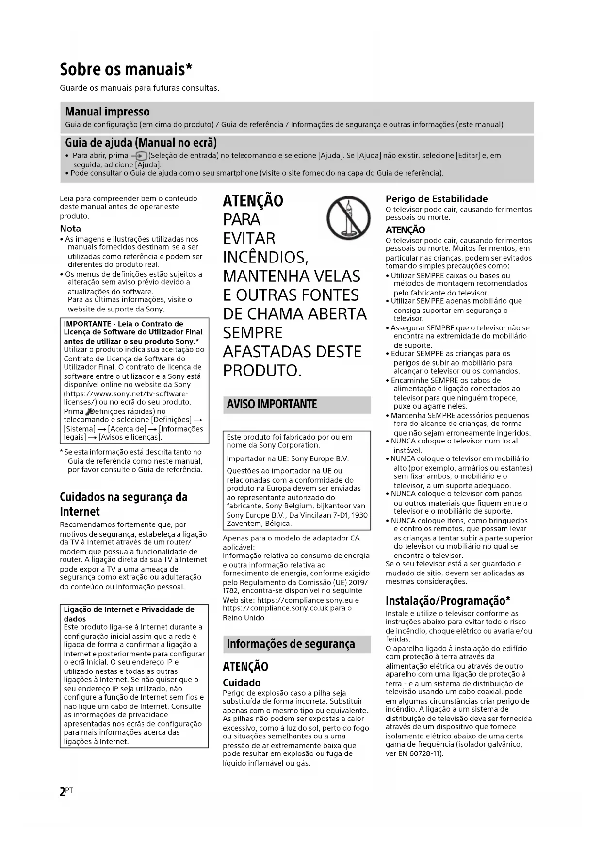 SEMPRE AFASTADAS DESTE PRODUTO. Apenas para o modelo de adaptador CA aplicável:Informação relativa ao consumo de energia e outra informação relativa ao fornecimento de energia, conforme exigido pelo Regulamento da Comissão (UE) 2019/1782, encontra-se disponível no seguinte Web site: https://compliance.sony.eu ehttps://compliance.sony.co.uk para o Reino Unido ATENÇÃO Cuidado Perigo de explosão caso a pilha seja substituída de forma incorreta. Substituir apenas com o mesmo tipo ou equivalente.As pilhas não podem ser expostas a calor excessivo, como à luz do sol, perto do fogo ou situações semelhantes ou a uma pressão de ar extremamente baixa que pode resultar em explosão ou fuga de líquido inflamável ou gás. Perigo de Estabilidade O televisor pode cair, causando ferimentos pessoais ou morte. ATENÇÃO O televisor pode cair, causando ferimentos pessoais ou morte. Muitos ferimentos, em particular nas crianças, podem ser evitados tomando simples precauções como:• Utilizar SEMPRE caixas ou bases ou métodos de montagem recomendados pelo fabricante do televisor.• Utilizar SEMPRE apenas mobiliário que consiga suportar em segurança o televisor.• Assegurar SEMPRE que o televisor não se encontra na extremidade do mobiliário de suporte.• Educar SEMPRE as crianças para os perigos de subir ao mobiliário para alcançar o televisor ou os comandos.• Encaminhe SEMPRE os cabos de alimentação e ligação conectados ao televisor para que ninguém tropece, puxe ou agarre neles.• Mantenha SEMPRE acessórios pequenos fora do alcance de crianças, de forma que não sejam erroneamente ingeridos.• NUNCA coloque o televisor num local instável.• NUNCA coloque o televisor em mobiliário alto (por exemplo, armários ou estantes) sem fixar ambos, o mobiliário e o televisor, a um suporte adequado.• NUNCA coloque o televisor com panos ou outros materiais que fiquem entre o televisor e o mobiliário de suporte.• NUNCA coloque itens, como brinquedos e controlos remotos, que possam levar as crianças a tentar subir à parte superior do televisor ou mobiliário no qual se encontra o televisor.Se o seu televisor está a ser guardado e mudado de sítio, devem ser aplicadas as mesmas considerações. Instalação/Programação* Instale e utilize o televisor conforme as instruções abaixo para evitar todo o risco de incêndio, choque elétrico ou avaria e/ou feridas.O aparelho ligado à instalação do edifício com proteção à terra através da alimentação elétrica ou através de outro aparelho com uma ligação de proteção à terra - e a um sistema de distribuição de televisão usando um cabo coaxial, pode em algumas circunstâncias criar perigo de incêndio. A ligação a um sistema de distribuição de televisão deve ser fornecida através de um dispositivo que fornece isolamento elétrico abaixo de uma certa gama de frequência (isolador galvânico, ver EN 60728-11). Sobre os manuais* Guarde os manuais para futuras consultas. Manual impresso Guia de configuração (em cima do produto) / Guia de referência / Informações de segurança e outras informações (este manual). Guia de ajuda (Manual no ecrã)