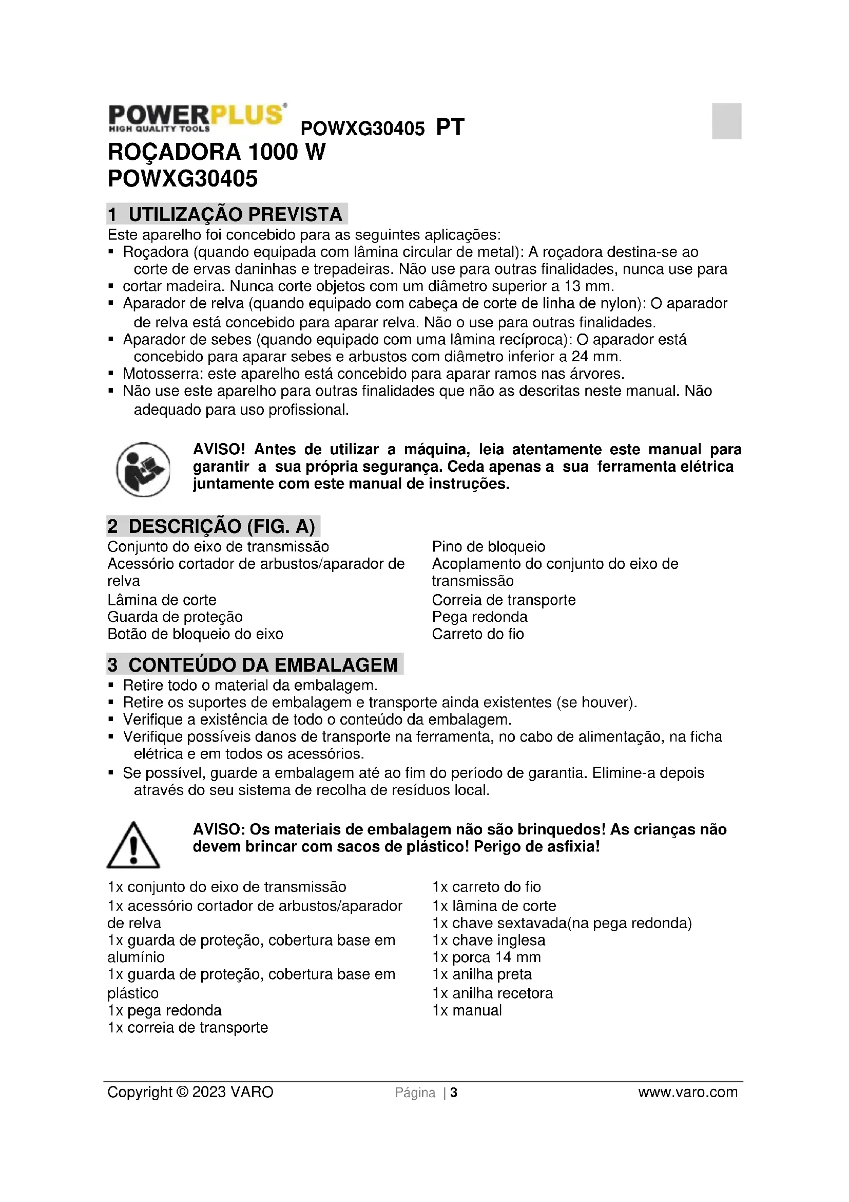 - Se possível, guarde a embalagem até ao fim do período de garantia. Elimine-a depois através do seu sistema de recolha de resíduos local. AVISO: Os materiais de embalagem não são brinquedos! As crianças não devem brincar com sacos de plástico! Perigo de asfixia! 1x conjunto do eixo de transmissão 1x acessório cortador de arbustos/aparador de relva 1x guarda de proteção, cobertura base em alumínio 1x guarda de proteção, cobertura base em plástico 1x pega redonda 1x correia de transporte 1x carreto do fio 1x lâmina de corte 1x chave sextavada(na pega redonda) 1x chave inglesa 1x porca 14 mm 1x anilha preta 1x anilha recetora 1x manualPOWXG30405 PT Copyright © 2023 VARO Página | 4 www.varo.com Caso haja partes em falta ou danificadas, por favor, contacte o seu comerciante. 4 SÍMBOLOS Neste manual e/ou na máquina são utilizados os seguintes símbolos: