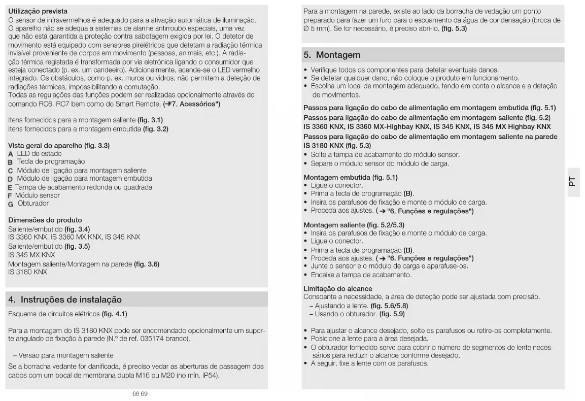 PT68 69 Utilização prevista O sensor de infravermelhos é adequado para a ativação automática de iluminação. O aparelho não se adequa a sistemas de alarme antirroubo especiais, uma vez que não está garantida a proteção contra sabotagem exigida por lei. O detetor de movimento está equipado com sensores pirelétricos que detetam a radiação térmica invisível proveniente de corpos em movimento (pessoas, animais, etc.). A radia- ção térmica registada é transformada por via eletrónica ligando o consumidor que esteja conectado (p. ex. um candeeiro). Adicionalmente, acende-se o LED vermelho integrado. Os obstáculos, como p. ex. muros ou vidros, não permitem a deteção de radiações térmicas, impossibilitando a comutação. Todas as regulações das funções podem ser realizadas opcionalmente através do comando RC6, RC7 bem como do Smart Remote. ( "7 Acessórios") Itens fornecidos para a montagem saliente (fig 31) Itens fornecidos para a montagem embutida (fig 32) Vista geral do aparelho (fig33) LED de estado Tecla de programação Módulo de ligação para montagem saliente Módulo de ligação para montagem embutida Tampa de acabamento redonda ou quadrada Módulo sensor Obturador Dimensões do produto Saliente/embutido (fig 34) IS3360 KNX, IS3360 MX KNX, IS345KNX Saliente/embutido (fig35) IS345 MXKNX Montagem saliente/Montagem na parede (fig 36) IS3180KNX 4 Instruções de instalação Esquema de circuitos elétricos (fig41) Para a montagem do IS3180KNX pode ser encomendado opcionalmente um supor- te angulado de fixação à parede (N.º de ref.035174 branco). – Versão para montagem saliente Se a borracha vedante for danificada, é preciso vedar as aberturas de passagem dos cabos com um bocal de membrana dupla M16 ou M20 (no mín. IP54). Para a montagem na parede, existe ao lado da borracha de vedação um ponto preparado para fazer um furo para o escoamento da água de condensação (broca de Ø 5mm). Se for necessário, é preciso abri-lo. (fig53) 5 Montagem