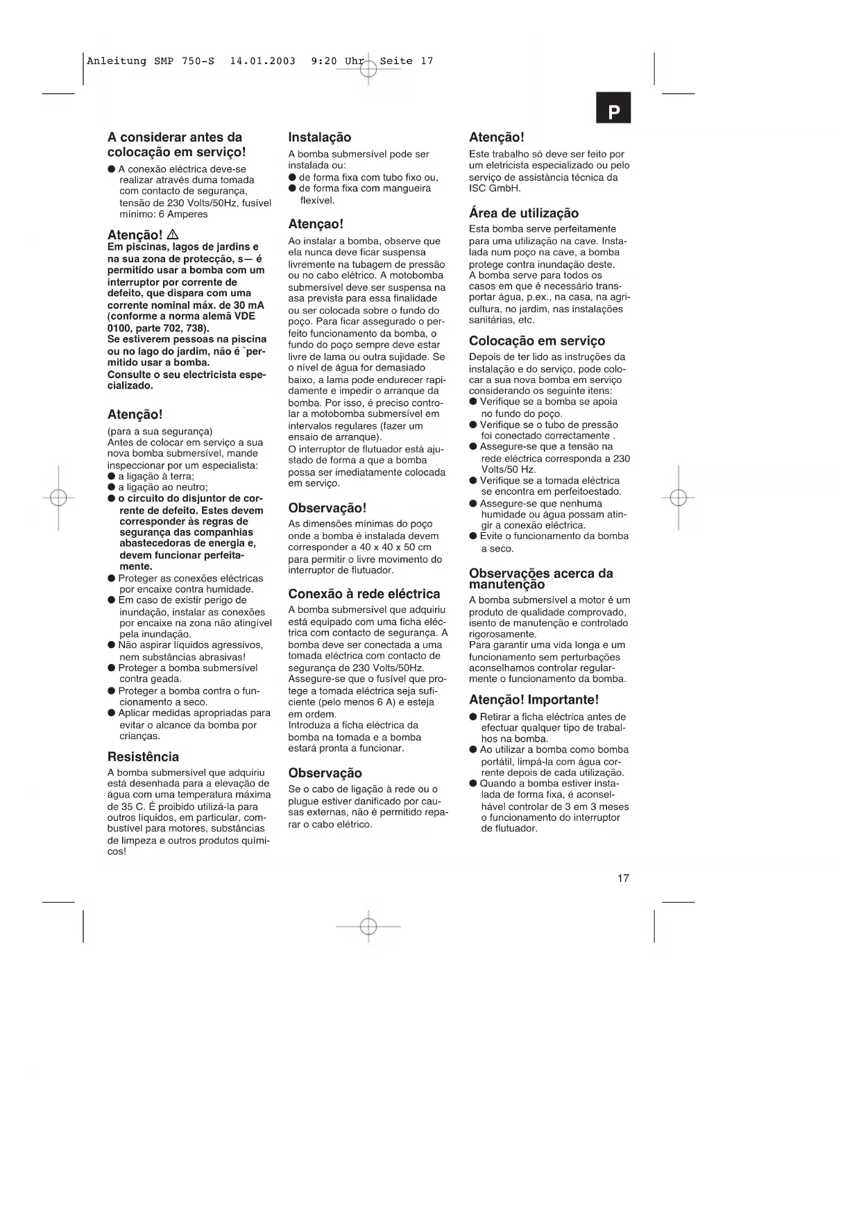 Tensión de la red: 230 V ~ 50 Hz Potencia absorbida: 750 Watios Caudal max. 13.500l/h Capacidad de elevación max: 9 m Profundidad de inmersión max: 8 m Temp. max. del agua: 35ºC Conexión de manguera 11/2“ IG Impurezas hasta 35 mm Altura del punto de conexión: 50 cm Altura del punto de desconexión: 5 cm No. de art. 41.705.80 Características técnicas Rendimiento Altura de bombeo Caudal SMP 750-S 2 m max.: 13.000 l/h 4 m max.: 9.800 l/h 6 m max.: 5.300 l/h Anleitung SMP 750-S 14.01.2003 9:20 Uhr Seite 1617 A considerar antes da colocação em serviço! ● A conexão eléctrica deve-se realizar através duma tomada com contacto de segurança, tensão de 230 Volts/50Hz, fusível mínimo: 6 Amperes Atenção! Em piscinas, lagos de jardins e na sua zona de protecção, s— é permitido usar a bomba com um interruptor por corrente de defeito, que dispara com uma corrente nominal máx. de 30 mA (conforme a norma alemã VDE 0100, parte 702, 738). Se estiverem pessoas na piscina ou no lago do jardim, não é `per- mitido usar a bomba. Consulte o seu electricista espe- cializado. Atenção! (para a sua segurança) Antes de colocar em serviço a sua nova bomba submersível, mande inspeccionar por um especialista: ● a ligação à terra; ● a ligação ao neutro; ● o circuito do disjuntor de cor- rente de defeito. Estes devem corresponder às regras de segurança das companhias abastecedoras de energia e, devem funcionar perfeita- mente. ● Proteger as conexões eléctricas por encaixe contra humidade. ● Em caso de existir perigo de inundação, instalar as conexões por encaixe na zona não atingível pela inundação. ● Não aspirar líquidos agressivos, nem substâncias abrasivas! ● Proteger a bomba submersível contra geada. ● Proteger a bomba contra o fun- cionamento a seco. ● Aplicar medidas apropriadas para evitar o alcance da bomba por crianças. Resistência A bomba submersível que adquiriu está desenhada para a elevação de água com uma temperatura máxima de 35 C. É proibido utilizá-la para outros líquidos, em particular, com- bustível para motores, substâncias de limpeza e outros produtos quími- cos! Atenção! Este trabalho só deve ser feito por um eletricista especializado ou pelo serviço de assistància técnica da ISC GmbH. Área de utilização Esta bomba serve perfeitamente para uma utilização na cave. Insta- lada num poço na cave, a bomba protege contra inundação deste. A bomba serve para todos os casos em que é necessário trans- portar água, p.ex., na casa, na agri- cultura, no jardim, nas instalações sanitárias, etc. Colocação em serviço Depois de ter lido as instruções da instalação e do serviço, pode colo- car a sua nova bomba em serviço considerando os seguinte itens: ● Verifique se a bomba se apoia no fundo do poço. ● Verifique se o tubo de pressão foi conectado correctamente . ● Assegure-se que a tensão na rede eléctrica corresponda a 230 Volts/50 Hz. ● Verifique se a tomada eléctrica se encontra em perfeitoestado. ● Assegure-se que nenhuma humidade ou água possam atin- gir a conexão eléctrica. ● Evite o funcionamento da bomba a seco. Observações acerca da manutenção A bomba submersível a motor é um produto de qualidade comprovado, isento de manutenção e controlado rigorosamente. Para garantir uma vida longa e um funcionamento sem perturbações aconselhamos controlar regular- mente o funcionamento da bomba. Atenção! Importante! ● Retirar a ficha eléctrica antes de efectuar qualquer tipo de trabal- hos na bomba. ● Ao utilizar a bomba como bomba portátil, limpá-la com água cor- rente depois de cada utilização. ● Quando a bomba estiver insta- lada de forma fixa, é aconsel- hável controlar de 3 em 3 meses o funcionamento do interruptor de flutuador. Instalação A bomba submersível pode ser instalada ou: ● de forma fixa com tubo fixo ou, ● de forma fixa com mangueira flexível. Atençao! Ao instalar a bomba, observe que ela nunca deve ficar suspensa livremente na tubagem de pressão ou no cabo elétrico. A motobomba submersível deve ser suspensa na asa prevista para essa finalidade ou ser colocada sobre o fundo do poço. Para ficar assegurado o per- feito funcionamento da bomba, o fundo do poço sempre deve estar livre de lama ou outra sujidade. Se o nível de água for demasiado baixo, a lama pode endurecer rapi- damente e impedir o arranque da bomba. Por isso, é preciso contro- lar a motobomba submersível em intervalos regulares (fazer um ensaio de arranque). O interruptor de flutuador está aju- stado de forma a que a bomba possa ser imediatamente colocada em serviço. Observação! As dimensões mínimas do poço onde a bomba é instalada devem corresponder a 40 x 40 x 50 cm para permitir o livre movimento do interruptor de flutuador. Conexão à rede eléctrica A bomba submersível que adquiriu está equipado com uma ficha eléc- trica com contacto de segurança. A bomba deve ser conectada a uma tomada eléctrica com contacto de segurança de 230 Volts/50Hz. Assegure-se que o fusível que pro- tege a tomada eléctrica seja sufi- ciente (pelo menos 6 A) e esteja em ordem. Introduza a ficha eléctrica da bomba na tomada e a bomba estará pronta a funcionar. Observação Se o cabo de ligação à rede ou o plugue estiver danificado por cau- sas externas, não é permitido repa- rar o cabo elétrico.