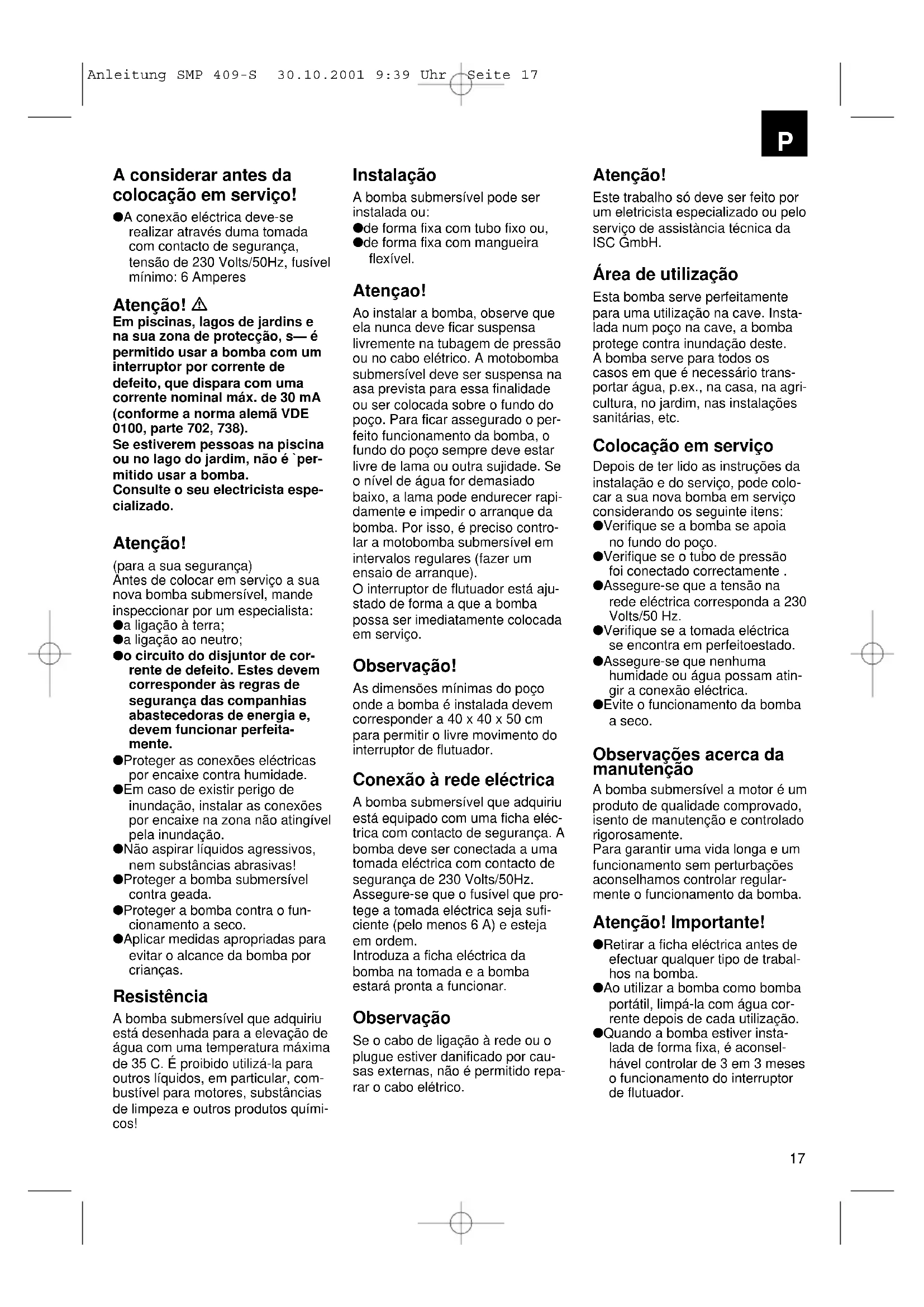 Tensión de la red: 230 V ~ 50 Hz Potencia absorbida: 400 Watios Caudal max. 9.000l/h Capacidad de elevación max: 5 m Profundidad de inmersión max: 5 m Temp. max. del agua: 35ºC Conexión de manguera 5/4“ AG Impurezas hasta 20 mm Altura del punto de conexión: 50 cm Altura del punto de desconexión: 5 cm No. de art. 41.705.40 Características técnicas Rendimiento Altura de bombeo Caudal SMP 409-S 2m max.: 7.000 l/h 3m max.: 5.500 l/h 4m max.: 3.000 l/h Anleitung SMP 409-S 30.10.2001 9:39 Uhr Seite 1617 A considerar antes da colocação em serviço! ● A conexão eléctrica deve-se realizar através duma tomada com contacto de segurança, tensão de 230 Volts/50Hz, fusível mínimo: 6 Amperes Atenção! Em piscinas, lagos de jardins e na sua zona de protecção, s— é permitido usar a bomba com um interruptor por corrente de defeito, que dispara com uma corrente nominal máx. de 30 mA (conforme a norma alemã VDE 0100, parte 702, 738). Se estiverem pessoas na piscina ou no lago do jardim, não é `per- mitido usar a bomba. Consulte o seu electricista espe- cializado. Atenção! (para a sua segurança) Antes de colocar em serviço a sua nova bomba submersível, mande inspeccionar por um especialista: ● a ligação à terra; ● a ligação ao neutro; ● o circuito do disjuntor de cor- rente de defeito. Estes devem corresponder às regras de segurança das companhias abastecedoras de energia e, devem funcionar perfeita- mente. ● Proteger as conexões eléctricas por encaixe contra humidade. ● Em caso de existir perigo de inundação, instalar as conexões por encaixe na zona não atingível pela inundação. ● Não aspirar líquidos agressivos, nem substâncias abrasivas! ● Proteger a bomba submersível contra geada. ● Proteger a bomba contra o fun- cionamento a seco. ● Aplicar medidas apropriadas para evitar o alcance da bomba por crianças. Resistência A bomba submersível que adquiriu está desenhada para a elevação de água com uma temperatura máxima de 35 C. É proibido utilizá-la para outros líquidos, em particular, com- bustível para motores, substâncias de limpeza e outros produtos quími- cos! Atenção! Este trabalho só deve ser feito por um eletricista especializado ou pelo serviço de assistància técnica da ISC GmbH. Área de utilização Esta bomba serve perfeitamente para uma utilização na cave. Insta- lada num poço na cave, a bomba protege contra inundação deste. A bomba serve para todos os casos em que é necessário trans- portar água, p.ex., na casa, na agri- cultura, no jardim, nas instalações sanitárias, etc. Colocação em serviço Depois de ter lido as instruções da instalação e do serviço, pode colo- car a sua nova bomba em serviço considerando os seguinte itens: ● Verifique se a bomba se apoia no fundo do poço. ● Verifique se o tubo de pressão foi conectado correctamente . ● Assegure-se que a tensão na rede eléctrica corresponda a 230 Volts/50 Hz. ● Verifique se a tomada eléctrica se encontra em perfeitoestado. ● Assegure-se que nenhuma humidade ou água possam atin- gir a conexão eléctrica. ● Evite o funcionamento da bomba a seco. Observações acerca da manutenção A bomba submersível a motor é um produto de qualidade comprovado, isento de manutenção e controlado rigorosamente. Para garantir uma vida longa e um funcionamento sem perturbações aconselhamos controlar regular- mente o funcionamento da bomba. Atenção! Importante! ● Retirar a ficha eléctrica antes de efectuar qualquer tipo de trabal- hos na bomba. ● Ao utilizar a bomba como bomba portátil, limpá-la com água cor- rente depois de cada utilização. ● Quando a bomba estiver insta- lada de forma fixa, é aconsel- hável controlar de 3 em 3 meses o funcionamento do interruptor de flutuador. Instalação A bomba submersível pode ser instalada ou: ● de forma fixa com tubo fixo ou, ● de forma fixa com mangueira flexível. Atençao! Ao instalar a bomba, observe que ela nunca deve ficar suspensa livremente na tubagem de pressão ou no cabo elétrico. A motobomba submersível deve ser suspensa na asa prevista para essa finalidade ou ser colocada sobre o fundo do poço. Para ficar assegurado o per- feito funcionamento da bomba, o fundo do poço sempre deve estar livre de lama ou outra sujidade. Se o nível de água for demasiado baixo, a lama pode endurecer rapi- damente e impedir o arranque da bomba. Por isso, é preciso contro- lar a motobomba submersível em intervalos regulares (fazer um ensaio de arranque). O interruptor de flutuador está aju- stado de forma a que a bomba possa ser imediatamente colocada em serviço. Observação! As dimensões mínimas do poço onde a bomba é instalada devem corresponder a 40 x 40 x 50 cm para permitir o livre movimento do interruptor de flutuador. Conexão à rede eléctrica A bomba submersível que adquiriu está equipado com uma ficha eléc- trica com contacto de segurança. A bomba deve ser conectada a uma tomada eléctrica com contacto de segurança de 230 Volts/50Hz. Assegure-se que o fusível que pro- tege a tomada eléctrica seja sufi- ciente (pelo menos 6 A) e esteja em ordem. Introduza a ficha eléctrica da bomba na tomada e a bomba estará pronta a funcionar. Observação Se o cabo de ligação à rede ou o plugue estiver danificado por cau- sas externas, não é permitido repa- rar o cabo elétrico.