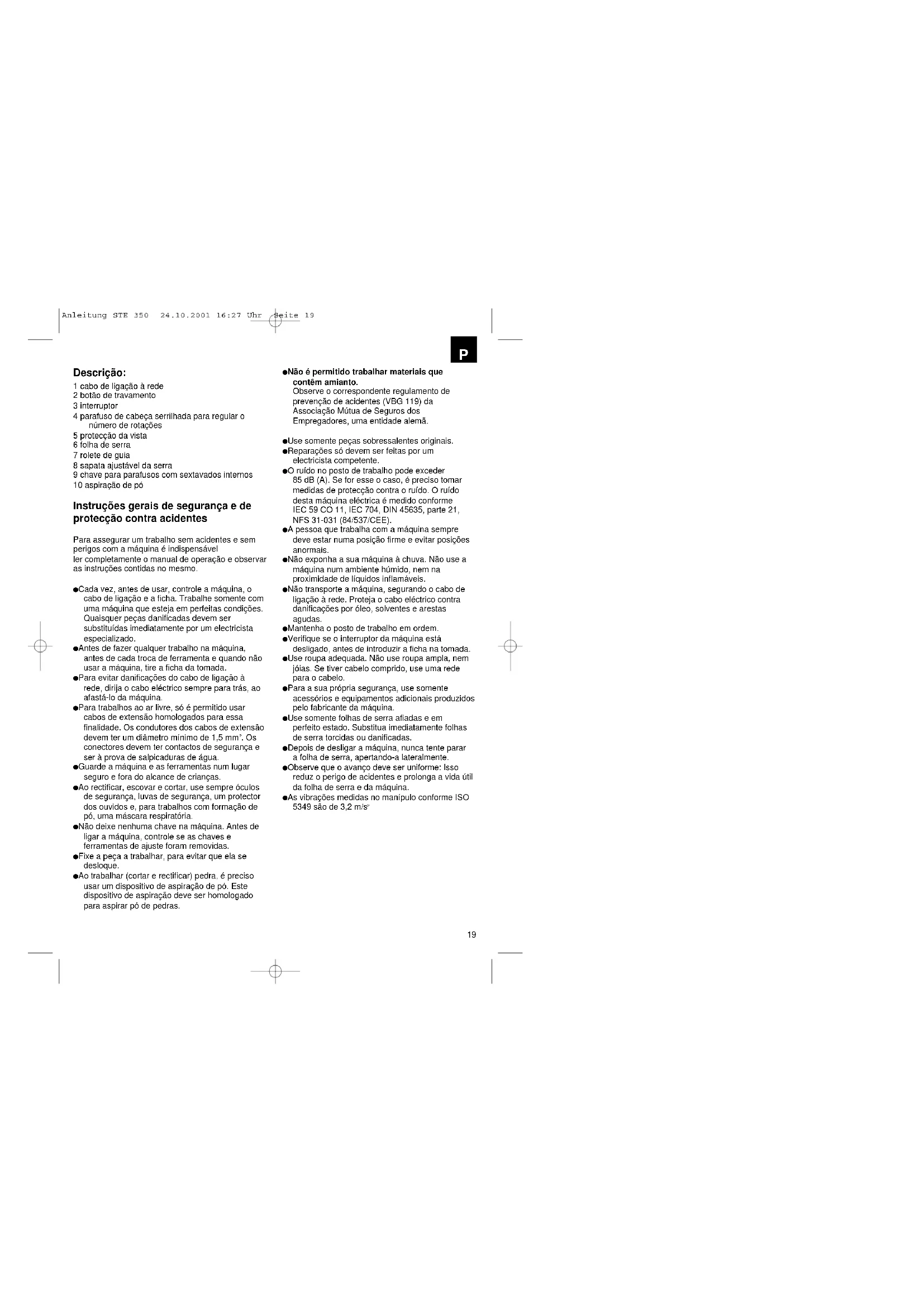 pieza de apoyo Anleitung STE 350 24.10.2001 16:27 Uhr Seite 1819 Descrição: 1 cabo de ligação à rede 2 botão de travamento 3 interruptor 4 parafuso de cabeça serrilhada para regular o número de rotações 5 protecção da vista 6 folha de serra 7 rolete de guia 8 sapata ajustável da serra 9 chave para parafusos com sextavados internos 10 aspiração de pó Instruções gerais de segurança e de protecção contra acidentes Para assegurar um trabalho sem acidentes e sem perigos com a máquina é indispensável ler completamente o manual de operação e observar as instruções contidas no mesmo. Cada vez, antes de usar, controle a máquina, o cabo de ligação e a ficha. Trabalhe somente com uma máquina que esteja em perfeitas condições. Quaisquer peças danificadas devem ser substituídas imediatamente por um electricista especializado. Antes de fazer qualquer trabalho na máquina, antes de cada troca de ferramenta e quando não usar a máquina, tire a ficha da tomada. Para evitar danificações do cabo de ligação à rede, dirija o cabo eléctrico sempre para trás, ao afastá-lo da máquina. Para trabalhos ao ar livre, só é permitido usar cabos de extensão homologados para essa finalidade. Os condutores dos cabos de extensão devem ter um diâmetro mínimo de 1,5 mm