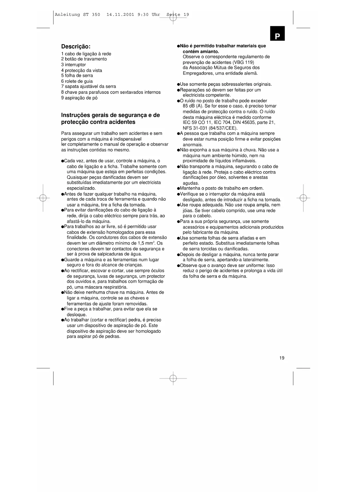 pieza de apoyo Anleitung ST 350 14.11.2001 9:30 Uhr Seite 1819 Descrição: 1 cabo de ligação à rede 2 botão de travamento 3 interruptor 4 protecção da vista 5 folha de serra 6 rolete de guia 7 sapata ajustável da serra 8 chave para parafusos com sextavados internos 9 aspiração de pó Instruções gerais de segurança e de protecção contra acidentes Para assegurar um trabalho sem acidentes e sem perigos com a máquina é indispensável ler completamente o manual de operação e observar as instruções contidas no mesmo. Cada vez, antes de usar, controle a máquina, o cabo de ligação e a ficha. Trabalhe somente com uma máquina que esteja em perfeitas condições. Quaisquer peças danificadas devem ser substituídas imediatamente por um electricista especializado. Antes de fazer qualquer trabalho na máquina, antes de cada troca de ferramenta e quando não usar a máquina, tire a ficha da tomada. Para evitar danificações do cabo de ligação à rede, dirija o cabo eléctrico sempre para trás, ao afastá-lo da máquina. Para trabalhos ao ar livre, só é permitido usar cabos de extensão homologados para essa finalidade. Os condutores dos cabos de extensão devem ter um diâmetro mínimo de 1,5 mm