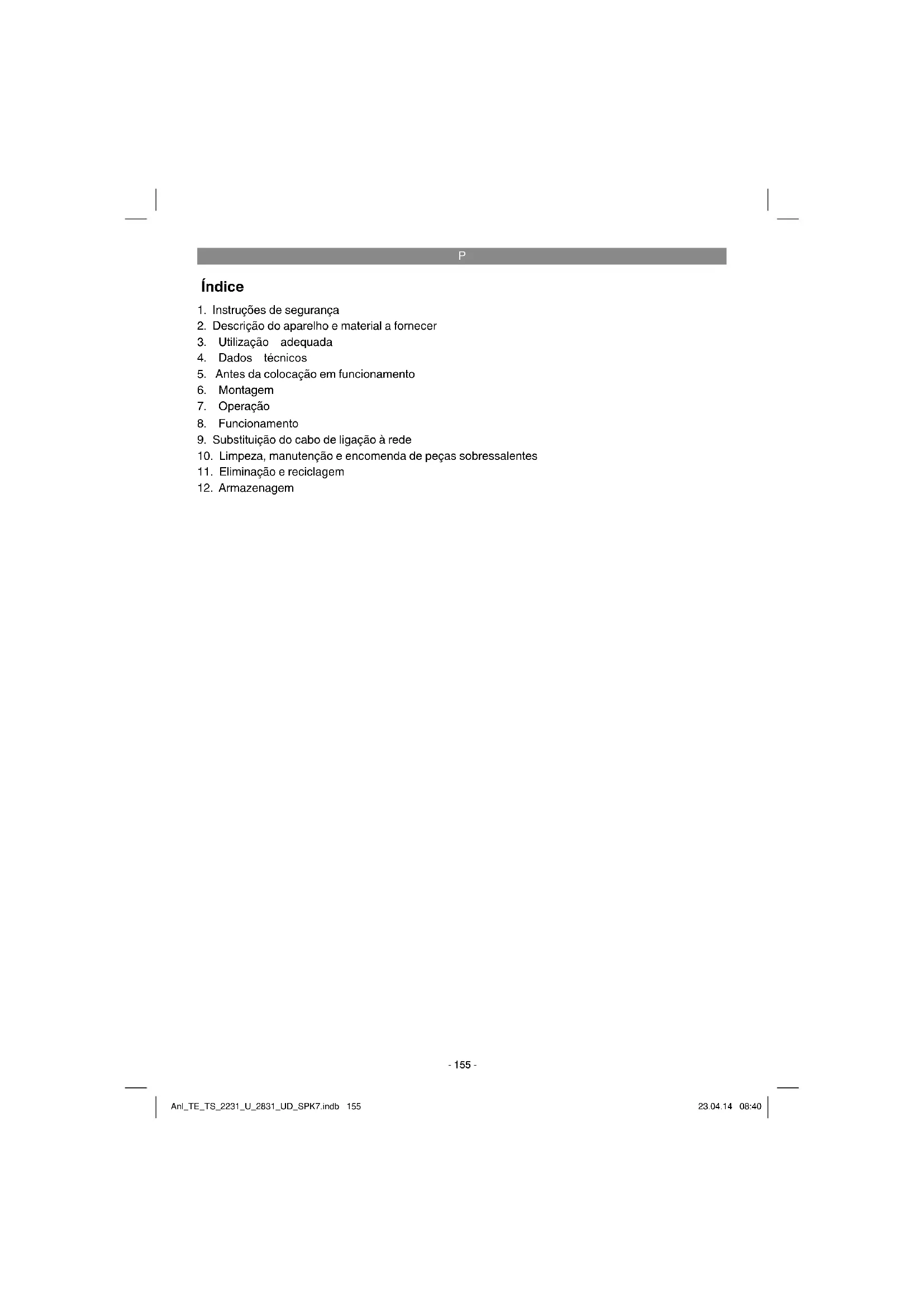 rede Perigo! Para evitar perigos, sempre que o cabo de li- gação à rede deste aparelho for danifi cado, é necessário que seja substituído pelo fabricante ou pelo seu serviço de assistência técnica ou por uma pessoa com qualifi cação. Anl_TE_TS_2231_U_2831_UD_SPK7.indb 165Anl_TE_TS_2231_U_2831_UD_SPK7.indb 165 23.04.14 08:4023.04.14 08:40P