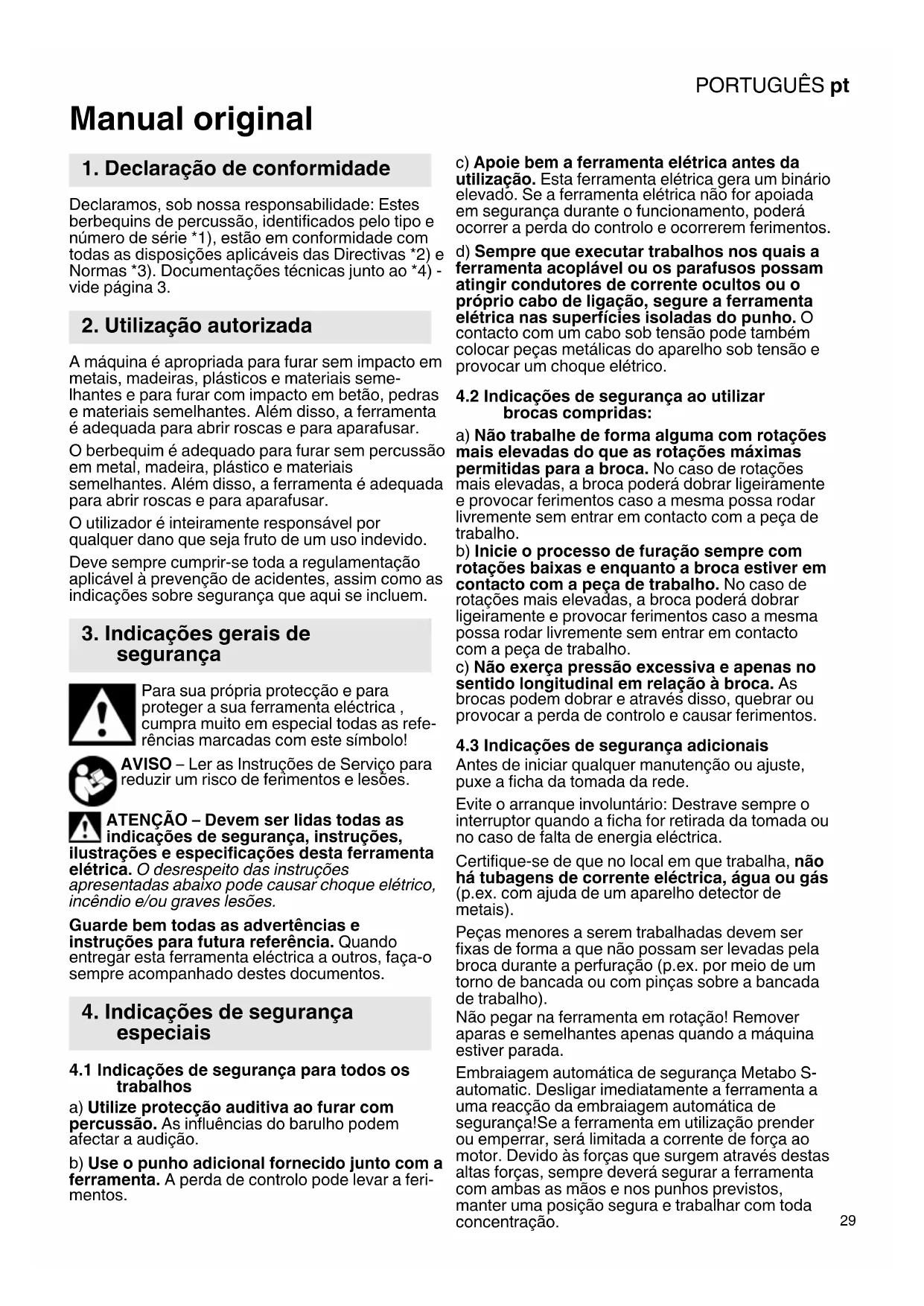 Manual original Declaramos, sob nossa responsabilidade: Estes berbequins de percussão, identificados pelo tipo e número de série *1), estão em conformidade com todas as disposições aplicáveis das Directivas *2) e Normas *3). Documentações técnicas junto ao *4) - vide página 3. A máquina é apropriada para furar sem impacto em metais, madeiras, plásticos e materiais seme- lhantes e para furar com impacto em betão, pedras e materiais semelhantes. Além disso, a ferramenta é adequada para abrir roscas e para aparafusar. O berbequim é adequado para furar sem percussão em metal, madeira, plástico e materiais semelhantes. Além disso, a ferramenta é adequada para abrir roscas e para aparafusar. O utilizador é inteiramente responsável por qualquer dano que seja fruto de um uso indevido. Deve sempre cumprir-se toda a regulamentação aplicável à prevenção de acidentes, assim como as indicações sobre segurança que aqui se incluem. Para sua própria protecção e para proteger a sua ferramenta eléctrica , cumpra muito em especial todas as refe- rências marcadas com este símbolo! AVISO – Ler as Instruções de Serviço para reduzir um risco de ferimentos e lesões. ATENÇÃO – Devem ser lidas todas as indicações de segurança, instruções, ilustrações e especificações desta ferramenta elétrica. O desrespeito das instruções apresentadas abaixo pode causar choque elétrico, incêndio e/ou graves lesões. Guarde bem todas as advertências e instruções para futura referência. Quando entregar esta ferramenta eléctrica a outros, faça-o sempre acompanhado destes documentos.