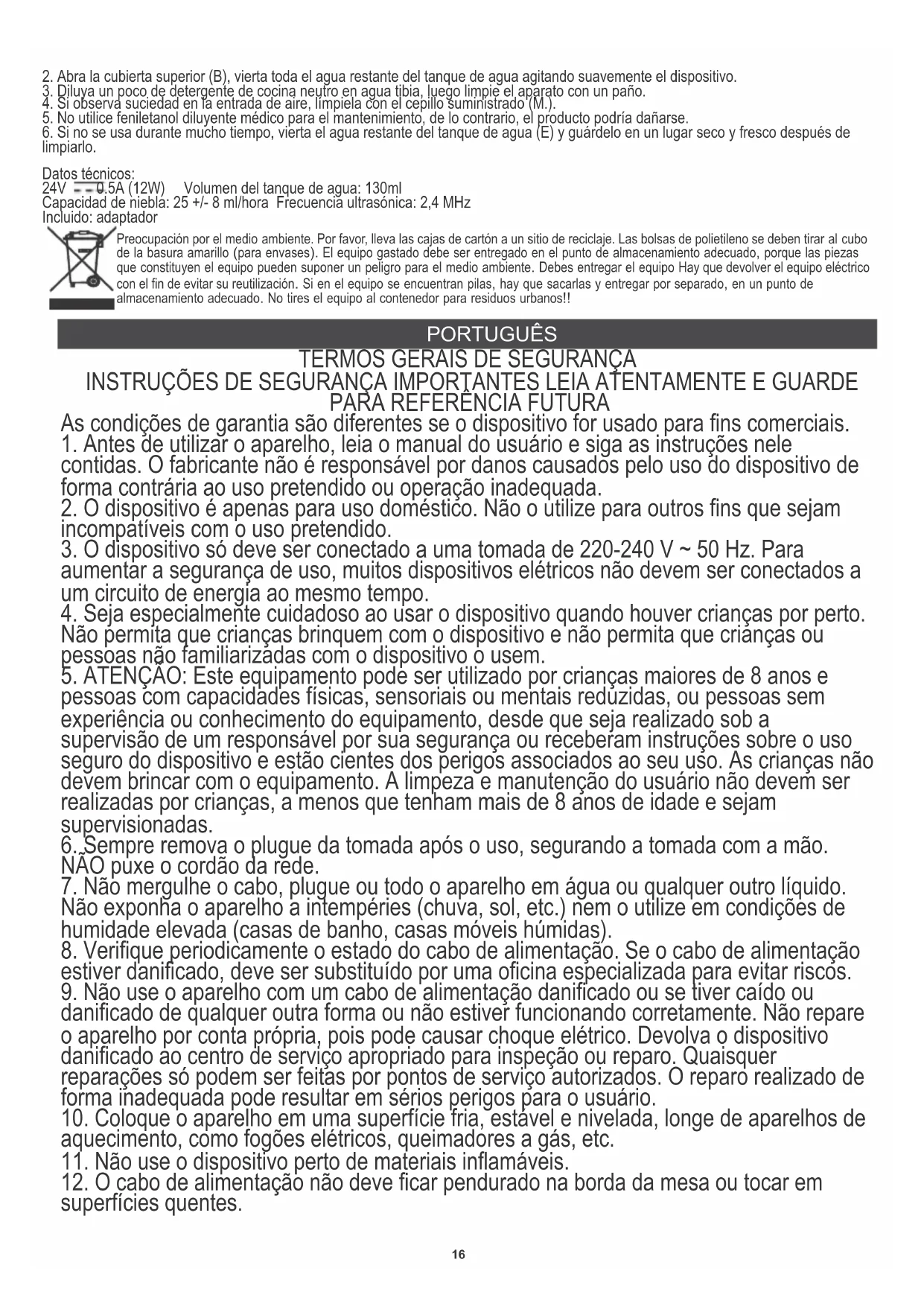 6. Se não for usado por um longo período de tempo, despeje a água restante do reservatório de água (E) e guarde-o em local seco e fresco após a limpeza. Dados técnicos: 24V 0,5A (12W) Volume do tanque de água: 130ml Capacidade de névoa: 25 +/- 8 ml/hora Frequência ultrassônica: 2,4 MH Inclui: adaptador Protecção do meio ambiente. Rogamos, os embalagens de cartão destinem-se para papéis velhos. Os sacos de polietileno (PE) devem-se colocar em contenedores para material plástico. O dispositivo usado deve-se levar a um ponto de armazenamento adequado porque os componentes perigosos que ficam dentro do dispositivo podem ser perigosos para o meio ambiente. O dispositivo elétrico deve-se entregar de modo que se reduza a sua nova utilização e uso. Se no dispositivo há pilhas, devem-se tirar e levar a um ponto de armazenamento em separado. Não colocar o dispositivo em contenedores para resíduos municipais!! LIETUVIŲ